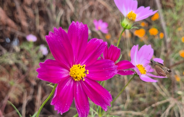 코스모스는 넓은 들판에 바람에 흔들리며 피어있는 모습이 종종 보입니다. 이러한 모습이 여유로움을 떠올리게 합니다.