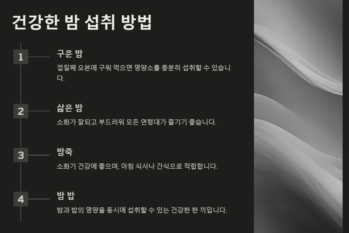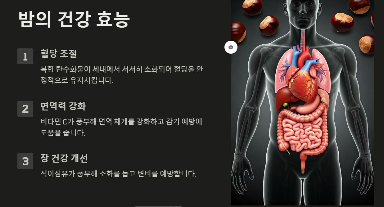 밤은 탄수화물이 풍부하므로 한 번에 너무 많이 먹으면 소화가 어려울 수 있으니 적당량 섭취하는 것이 좋습니다.