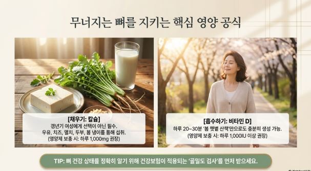 갱년기 여성에게 칼슘과 비타민 D는 선택이 아니라 필수입니다. 칼슘은 우유, 치즈, 멸치, 두부, 봄 냉이에 풍부합니다. 비타민 D는 하루 20~30분 봄 햇볕 산책만으로도 충분히 생성됩니다.