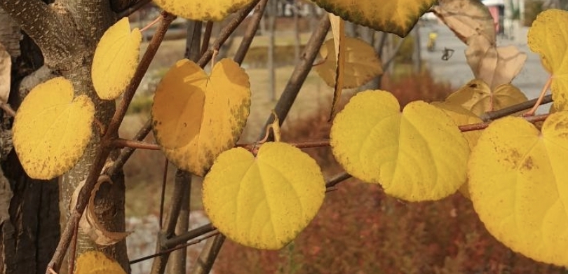 잎: 둥글고 심장 모양으로 마주나며, 부드러운 톱니가 있습니다. 여름에는 연한 녹색에서 가을에는 노란색이나 붉은색으로 단풍이 들어 아름답습니다.