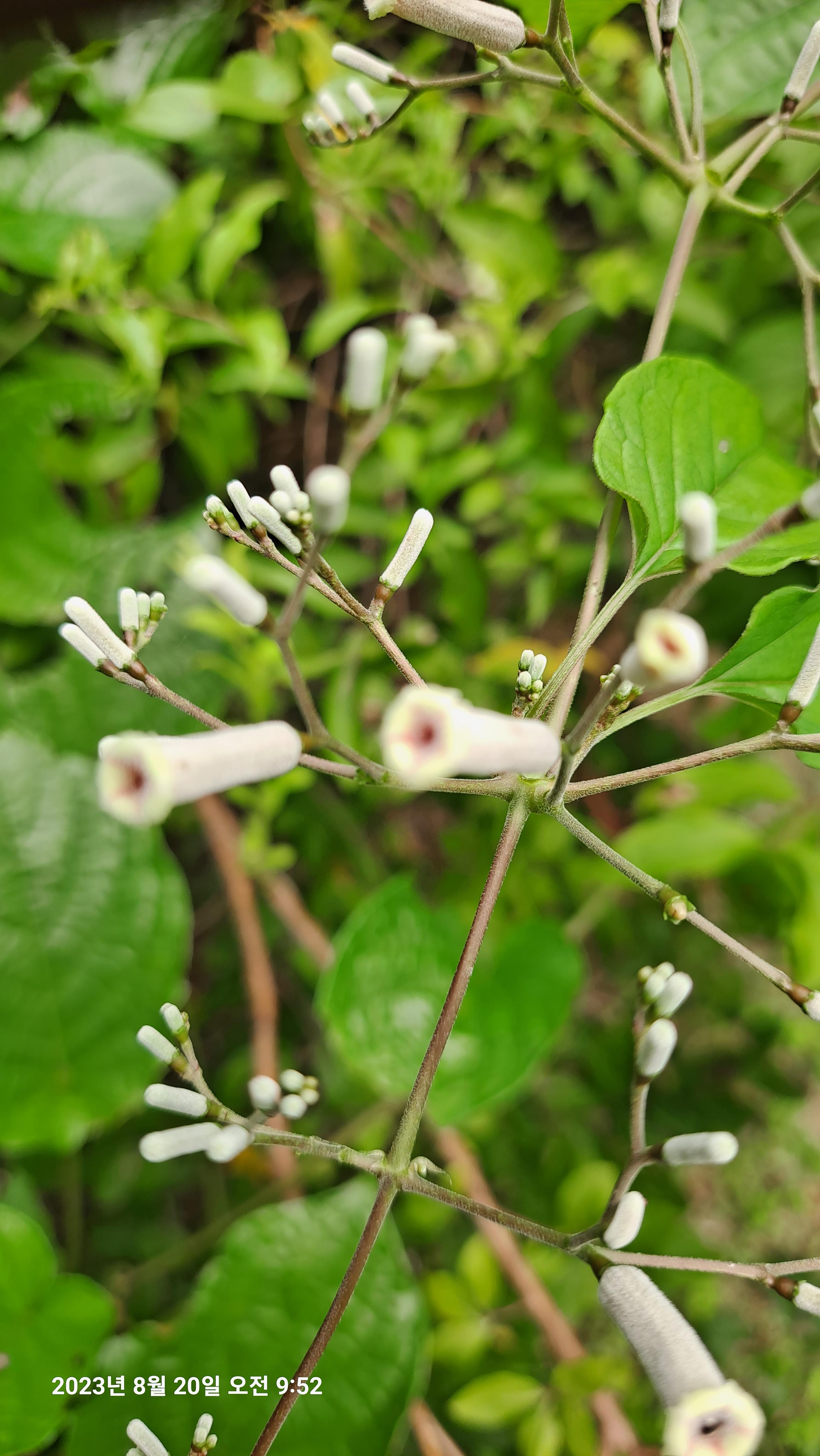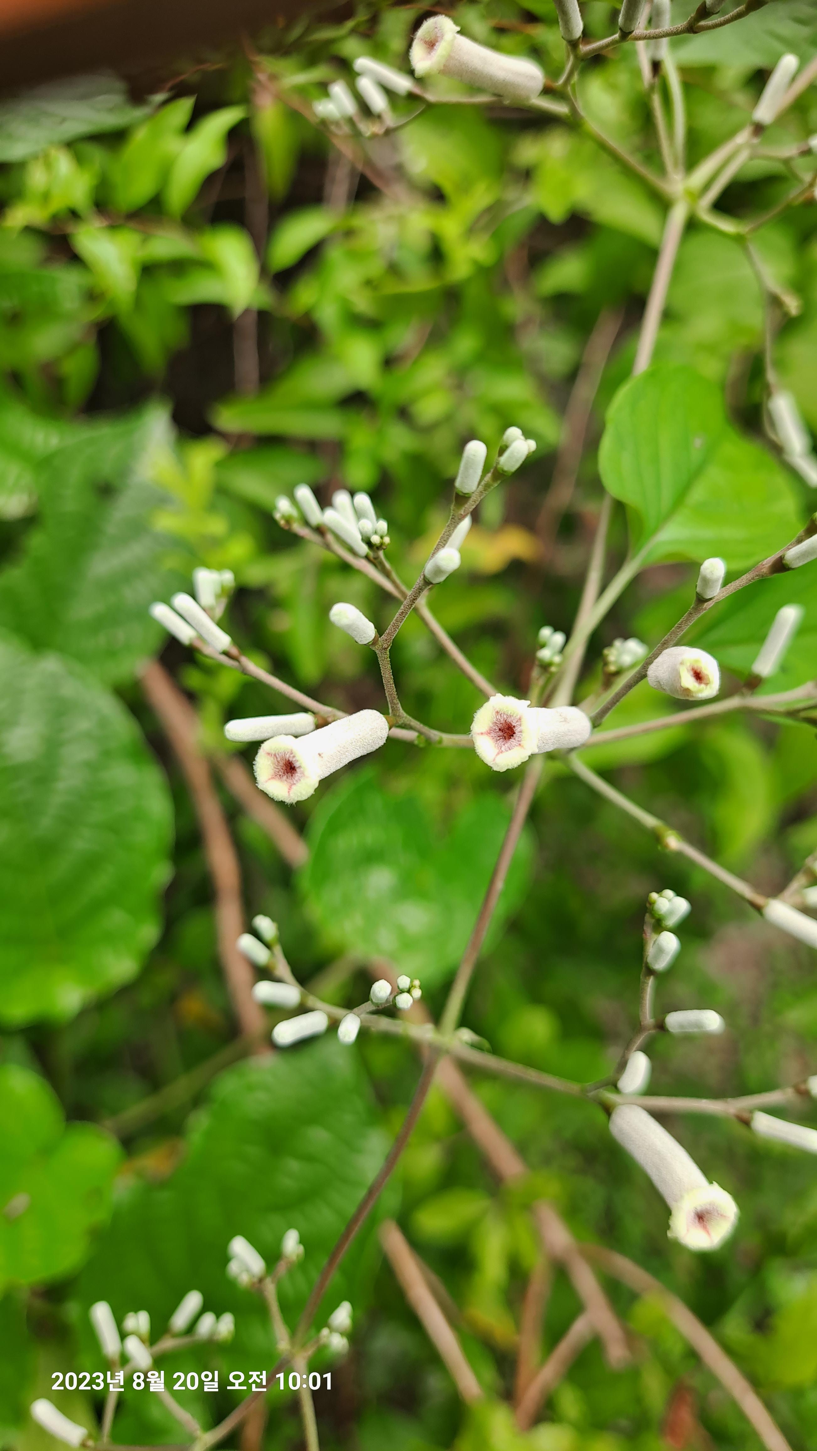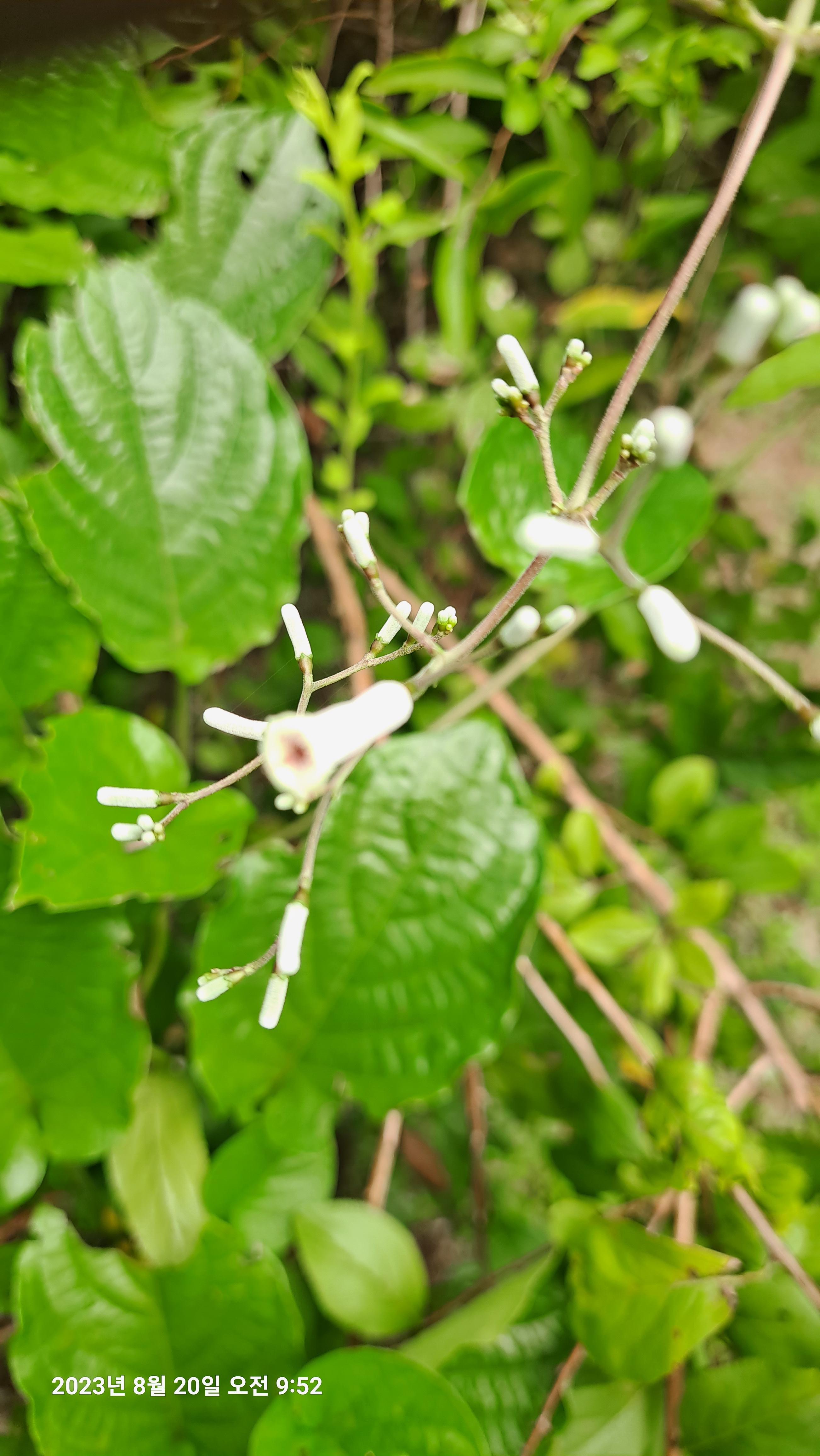 꽃은 7∼9월에 피는데, 흰색 바탕에 자줏빛 점이 있으며 안쪽은 자줏빛이고 지름 4∼6mm, 길이 1∼1.5cm이다. 줄기 끝이나 잎겨드랑이에 원추꽃차례 또는 취산꽃차례로 달린다. 꽃받침과 화관은 5갈래로 갈라지고 수술은 5개이다. 열매는 공 모양의 핵과로서 지름 5∼6mm이며 9∼10월에 노란빛을 띤 갈색으로 익는다. 관상용으로 심으며 한방과 민간에서 거담제·거풍제·신장염·이질 등에 약으로 쓴다.