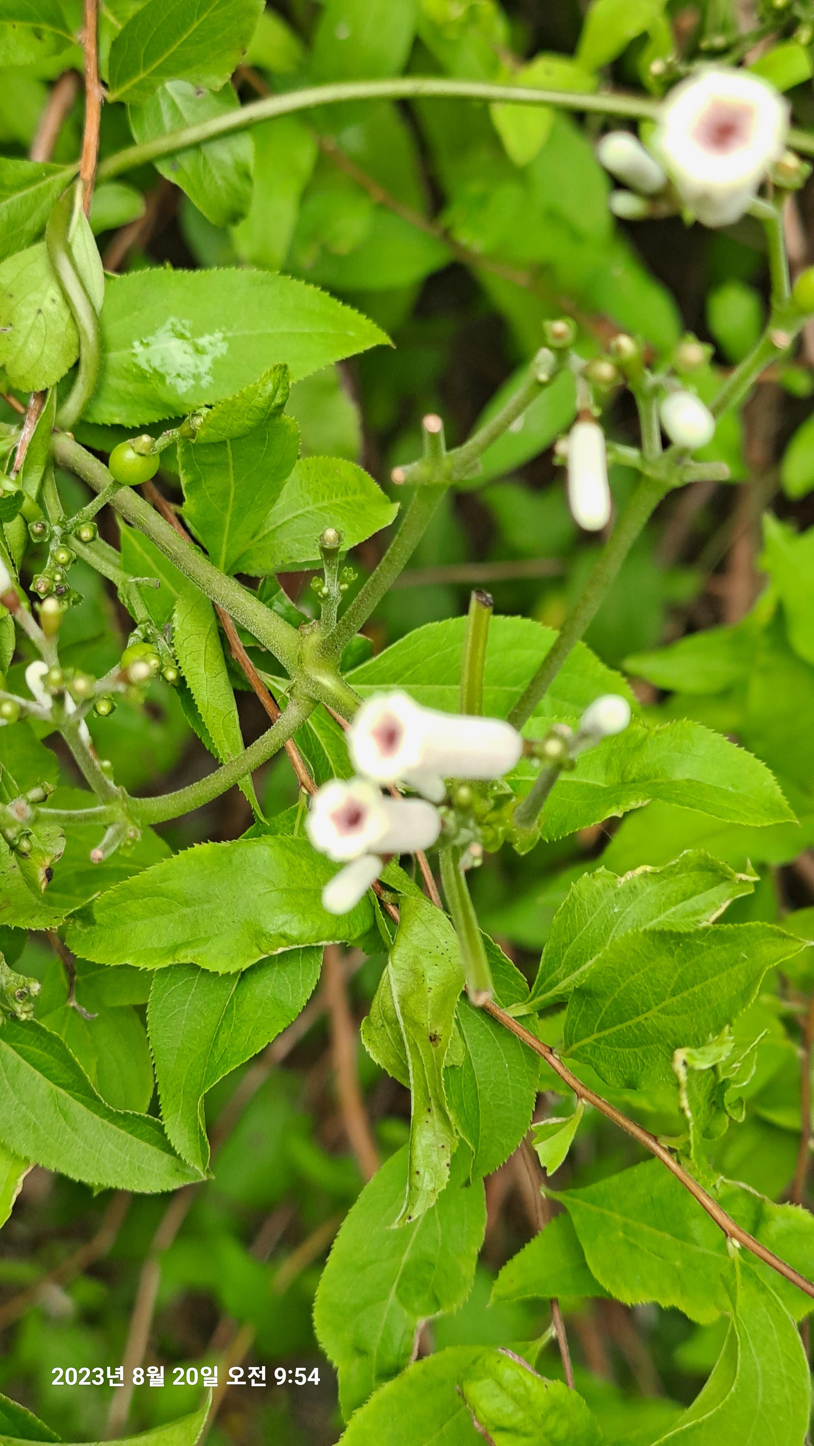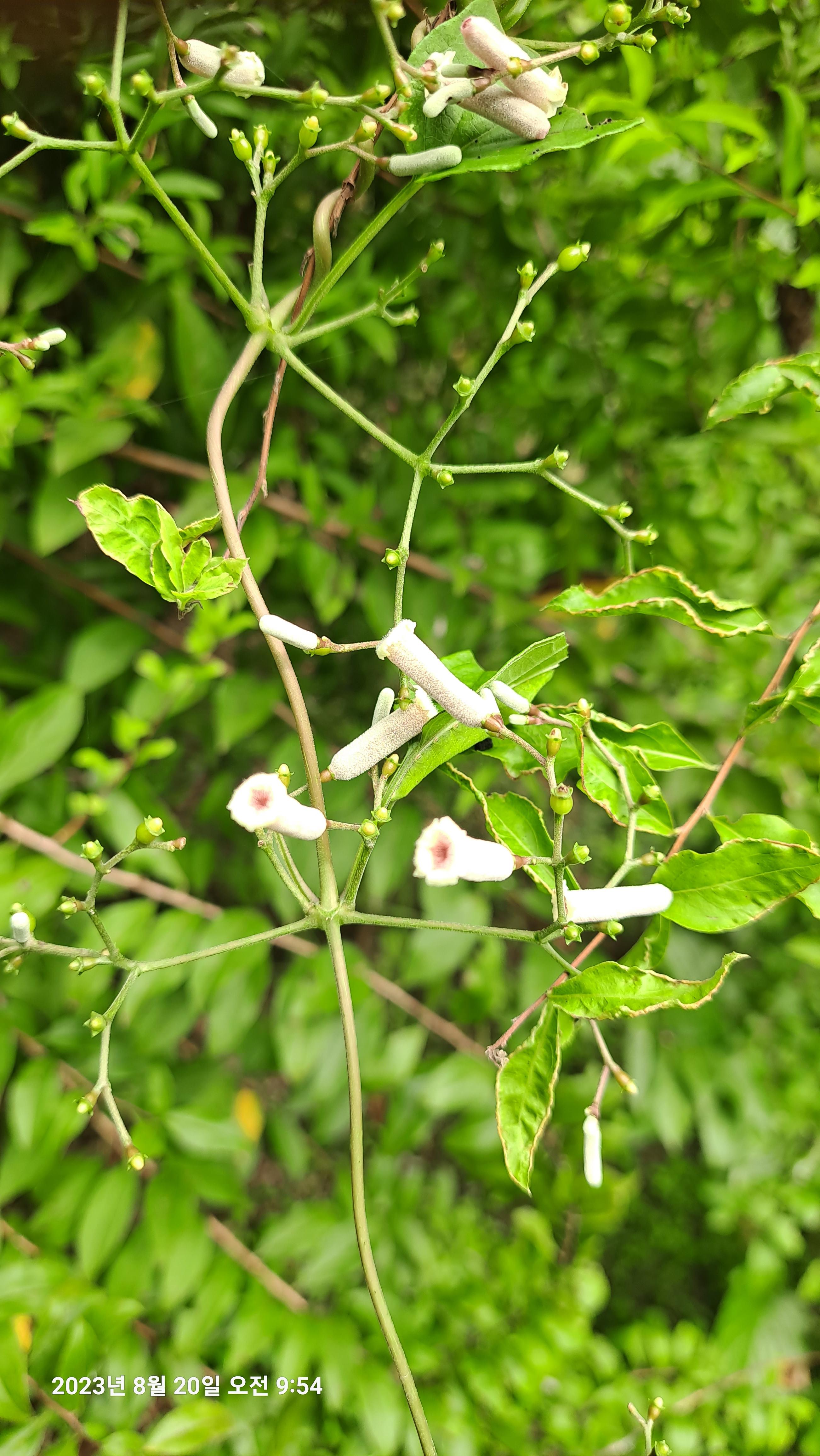구렁내덩굴·계각등이라고도 한다. 산기슭 양지바른 곳이나 바닷가 풀밭에서 자란다. 길이 5∼7m이다. 어린 가지에 잔털이 나고 독특한 냄새가 난다. 잎은 마주나고 달걀 모양이거나 달걀처럼 생긴 바소꼴이며 길이 5∼12cm, 나비 1∼7cm이다. 끝은 뾰족하고 밑부분은 심장 모양이거나 수평이다. 가장자리는 밋밋하고 뒷면에 잔털이 있거나 없으며 잎자루는 길이 1∼6cm이다.