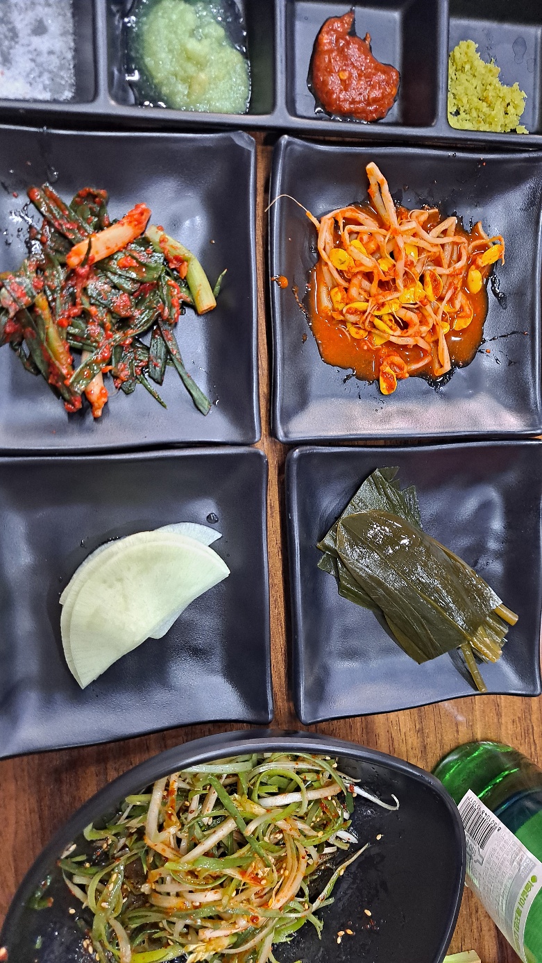 반찬은 김치 볶음이 있고, 파김치, 콩나물무침, 무쌈, 고추냉이, 명이나물, 마늘, 젓갈, 간 마늘, 야채(상추, 고추, 깻잎)