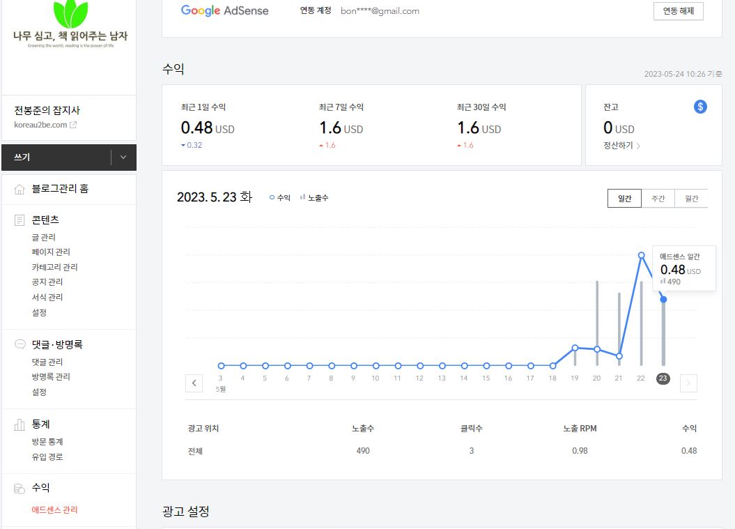 구글 광고 애드센스 2023년 5월 19일부터 연동, 광고 시작