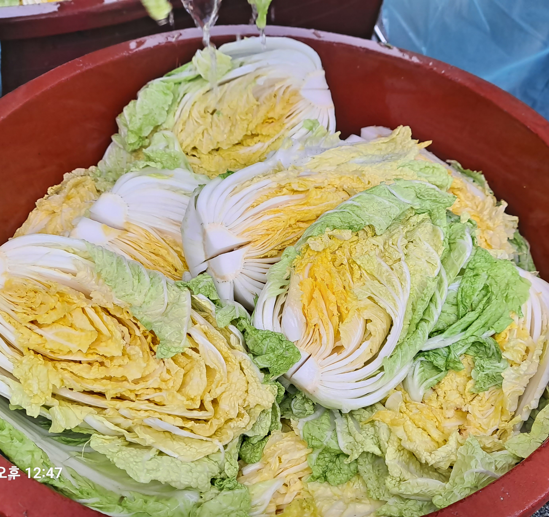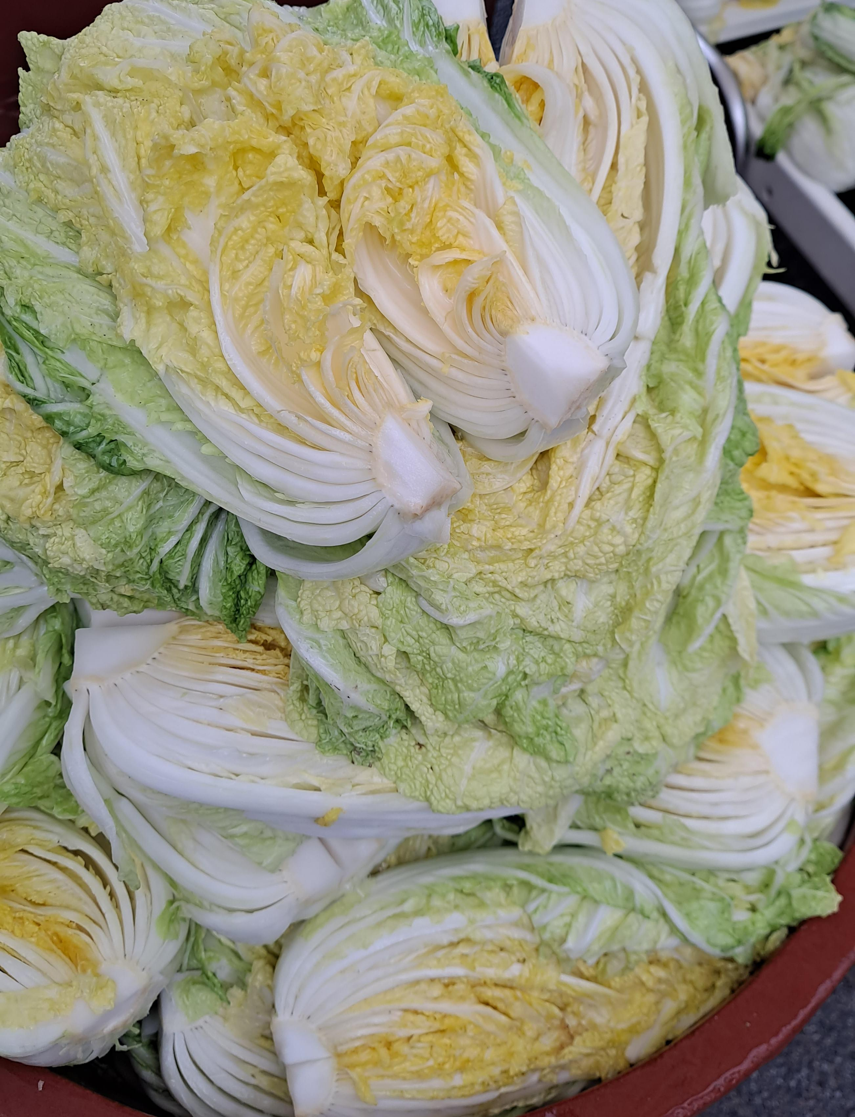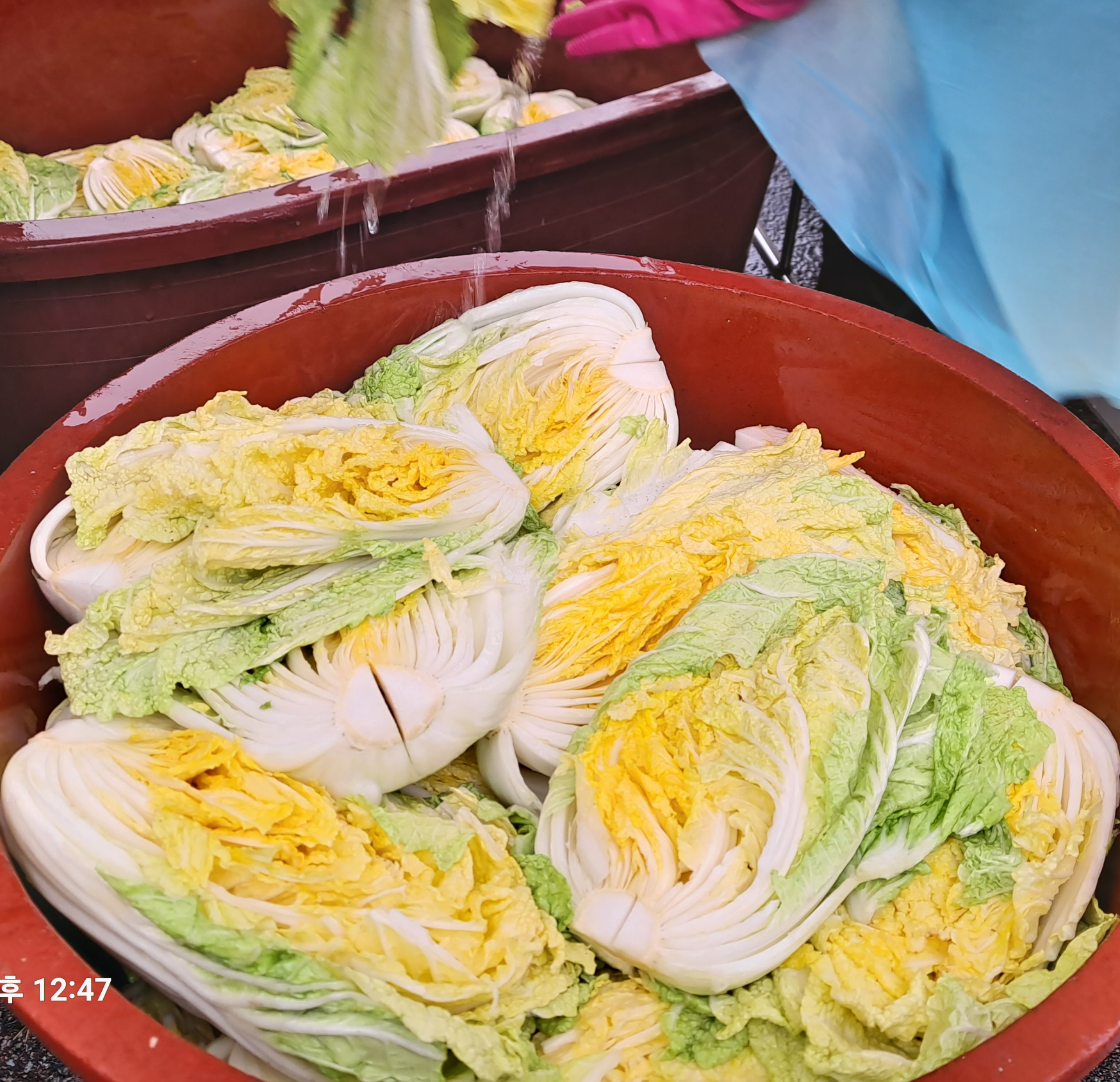 2. 배추 천연소금에 절이기 : 배추를 소금물에 절인 뒤, 일정 시간 동안 둬서 배추가 유연해질 때까지 기다립니다.