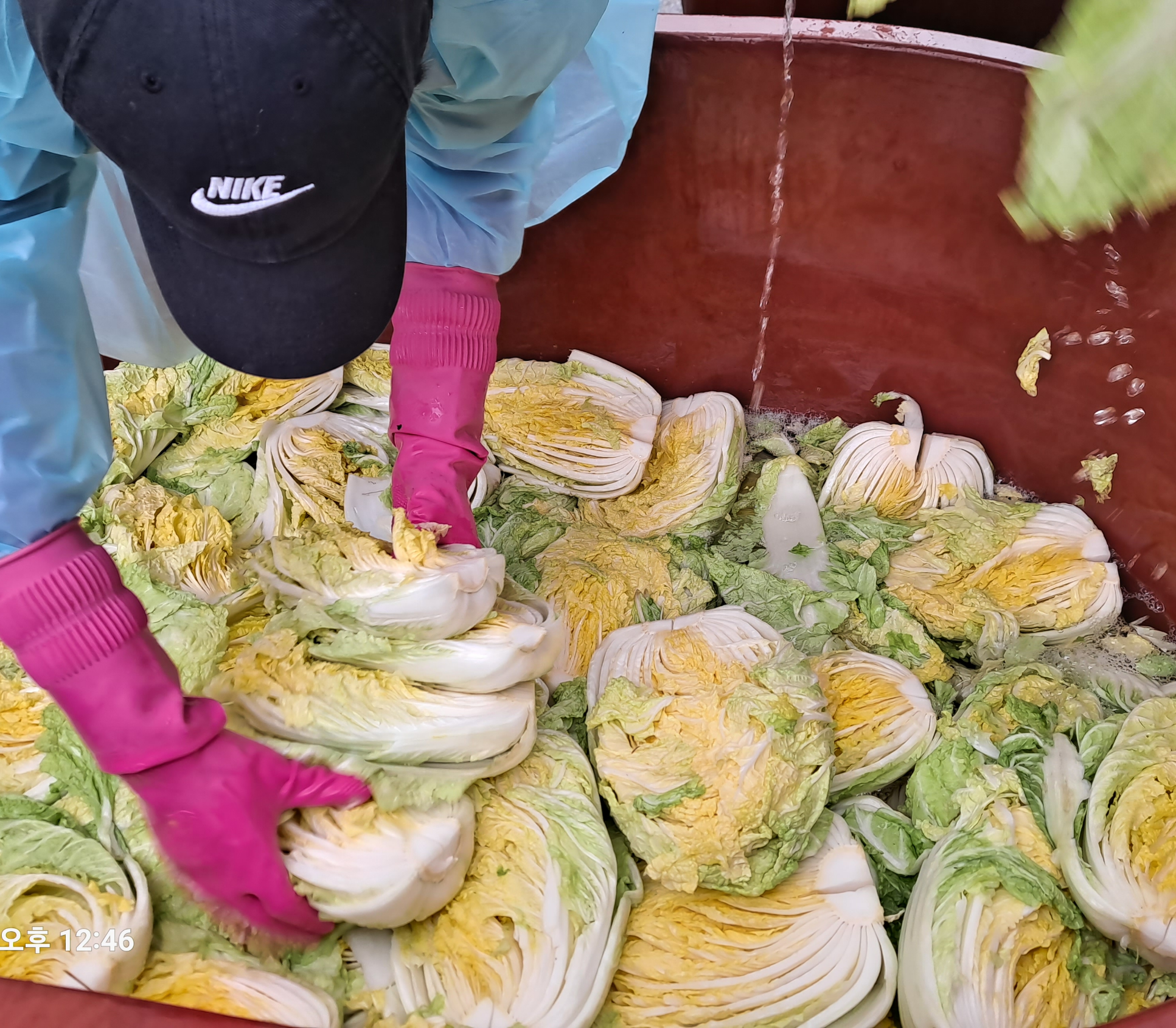2. 배추 천연소금에 절이기 : 배추를 소금물에 절인 뒤, 일정 시간 동안 둬서 배추가 유연해질 때까지 기다립니다.