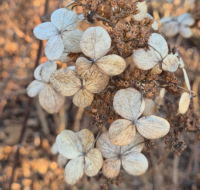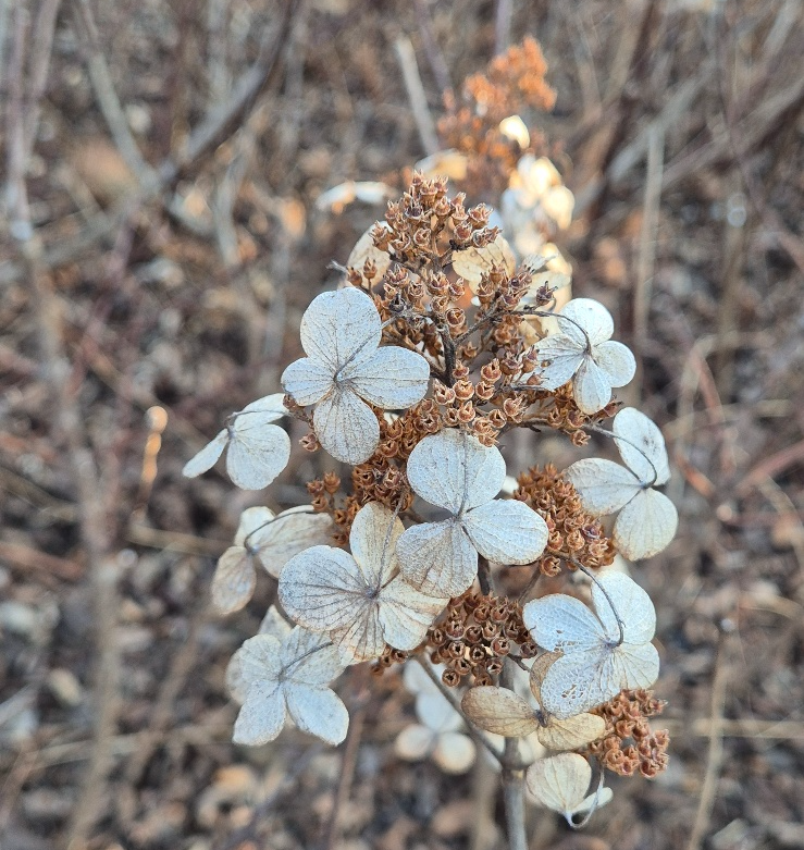 마치 겨울의 자연이 붓으로 그려낸 그림처럼, 이 나무수국의 꽃송이는 우리에게 살아 숨 쉬는 계절의 아름다움을 깨닫게 한다. 그 어떤 명화도 이 조화로움을 이길 수 없을 것이다.