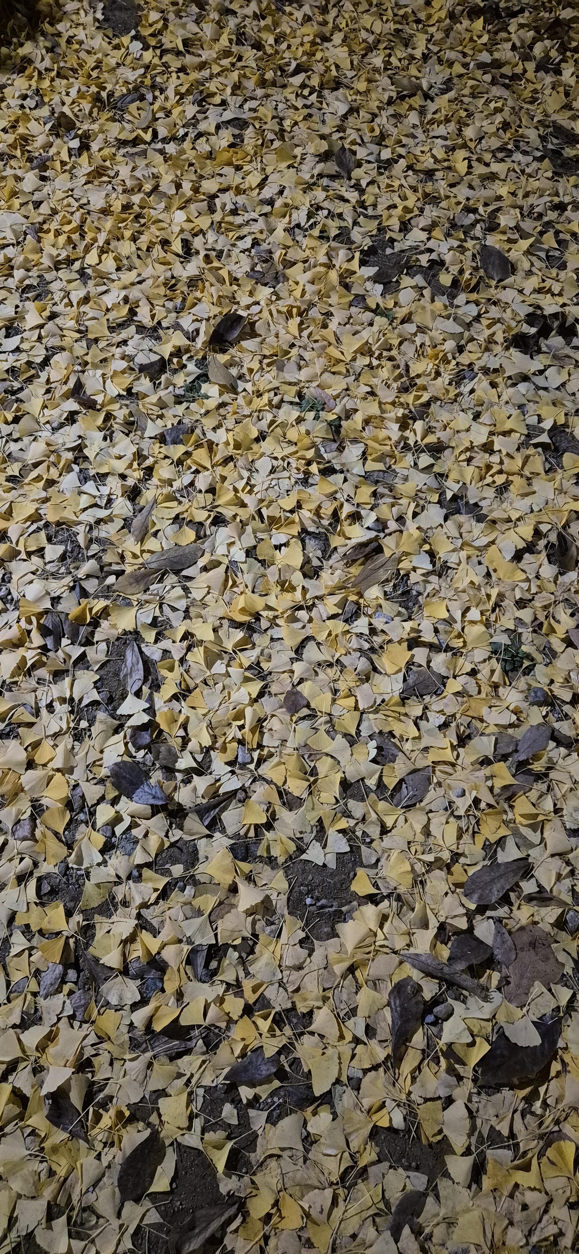 그 옆의 은행은 노란 나무잎을 바닥에 양보, 황금빛 바닥