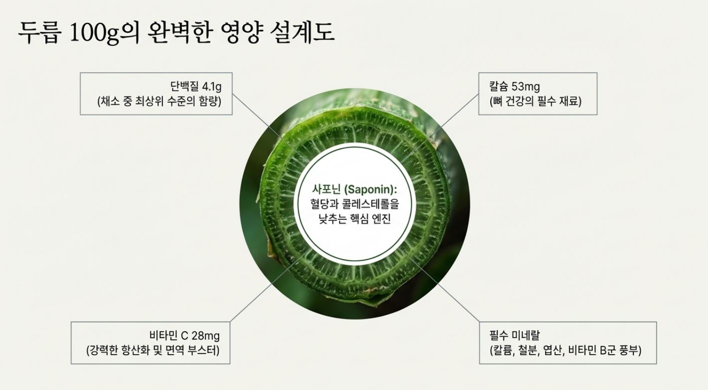 두릅에 풍부한 칼륨은 체내 나트륨을 배출시켜 혈압을 자연스럽게 낮춰줍니다. 봄철 일교차로 혈압이 불안정한 50·60대에게 아주 좋은 식품입니다.