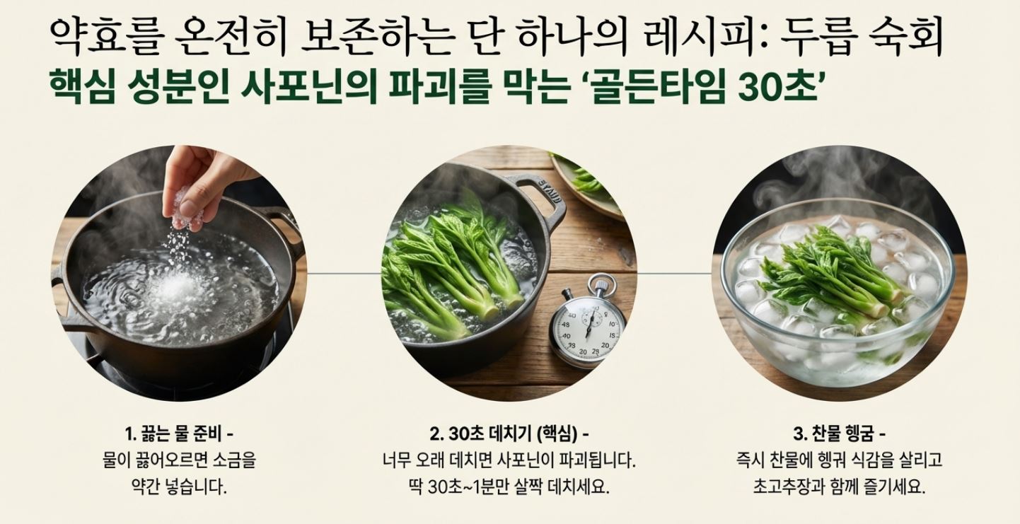 끓는 물에 소금을 약간 넣고 두릅을 30초~1분 살짝 데칩니다. 찬물에 바로 헹궈 초고추장에 찍어 드시면 됩니다. 이때 너무 오래 데치면 사포닌 성분이 파괴되니 30초가 핵심입니다.