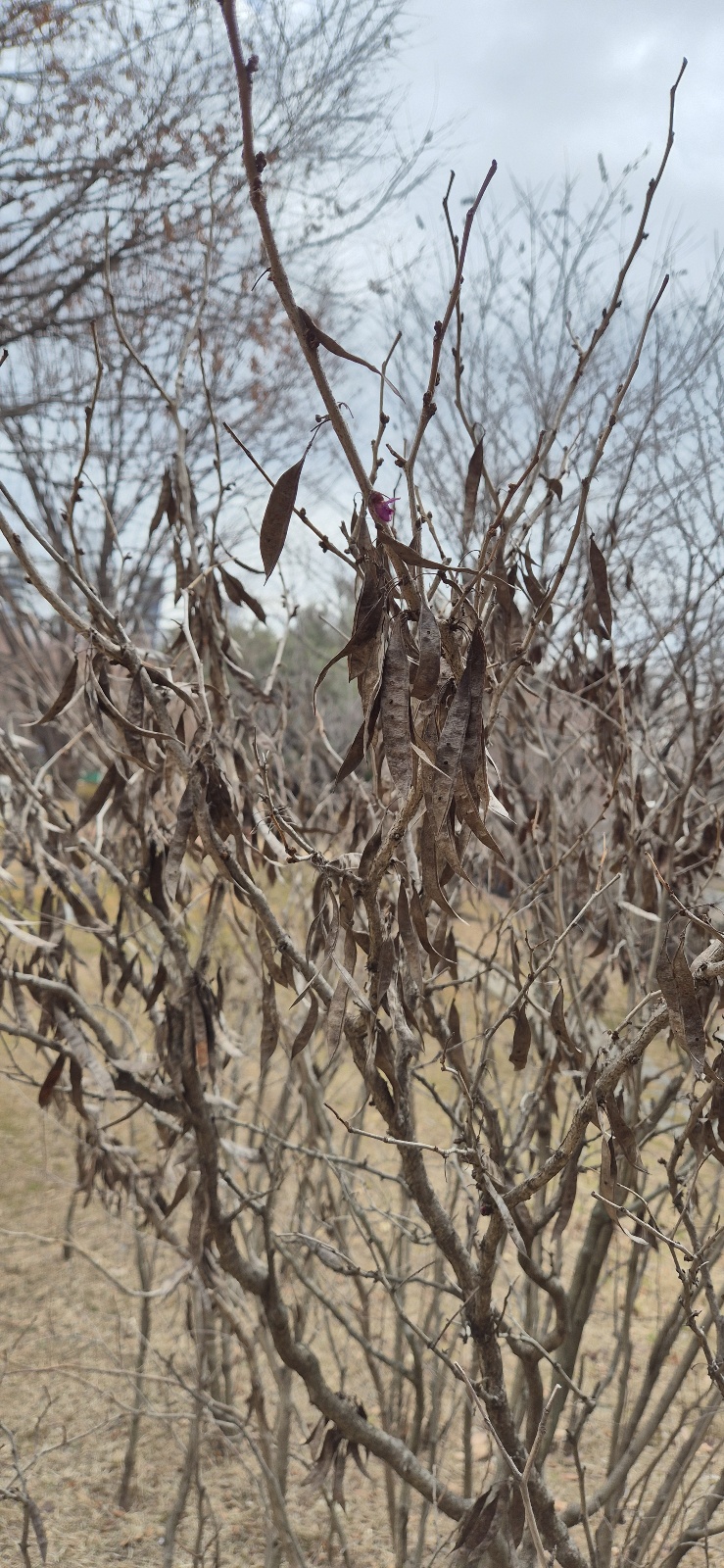 콩과의 낙엽 활엽 관목. 가지에 자주빛 밥 알 같은 붉은 꽃이 줄줄이 핀다.