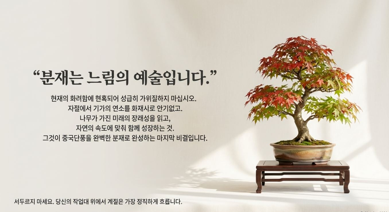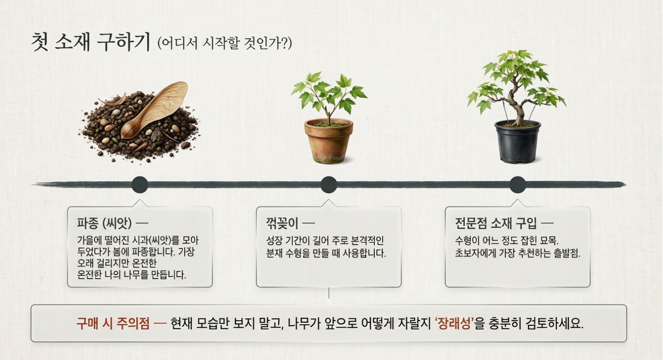 💡 분재 초보자를 위한 팁: 초보자는 단풍나무처럼 적응력이 높은 묘목을 구해서 시작하는 게 좋으며, 금의 상태가 보기 좋다고 선뜻 사지 말고 얼마나 장래성이 있는지 충분히 검토한 뒤 구입하는 것이 좋습니다. 분재는 '느림의 예술'이므로 서두르지 마세요.