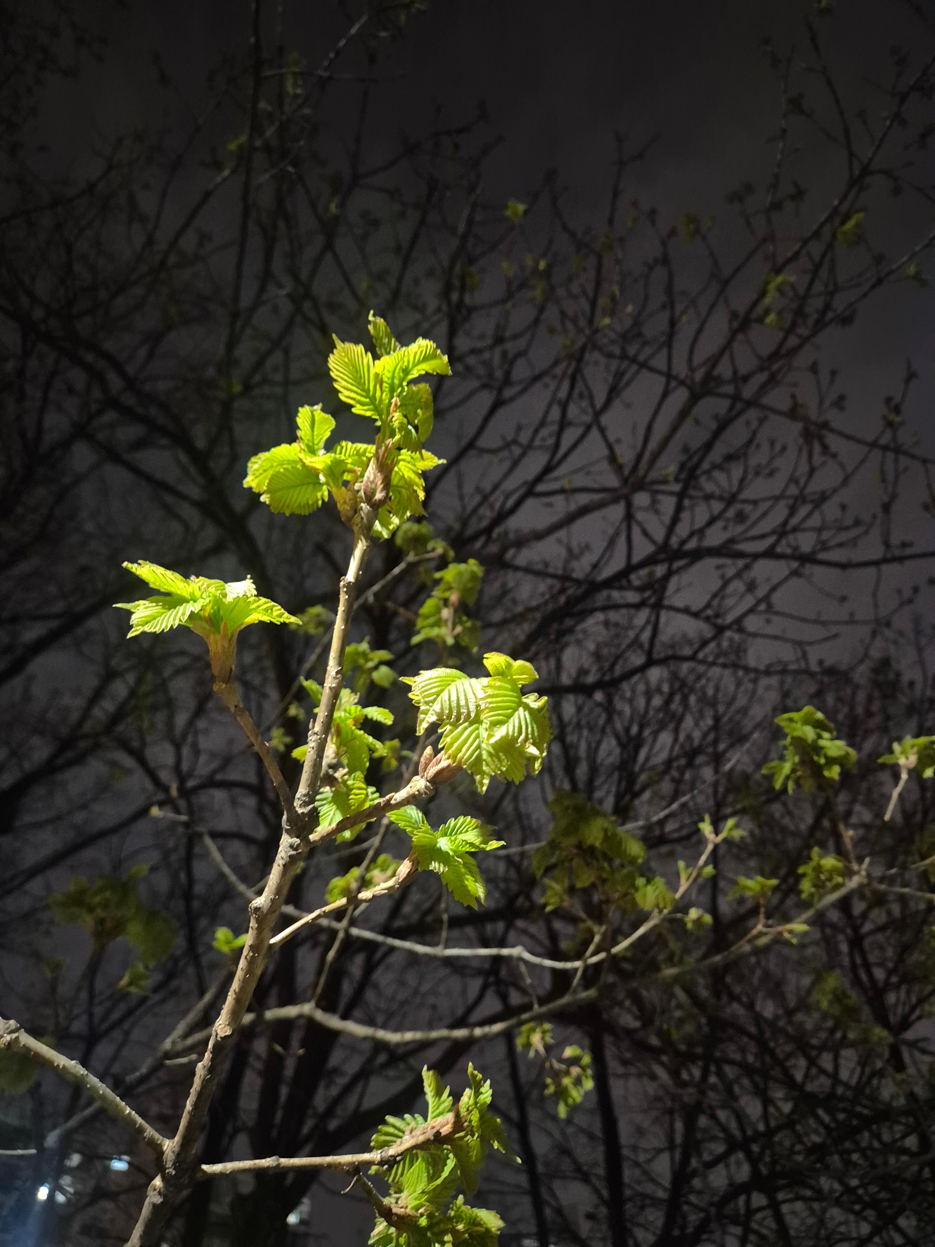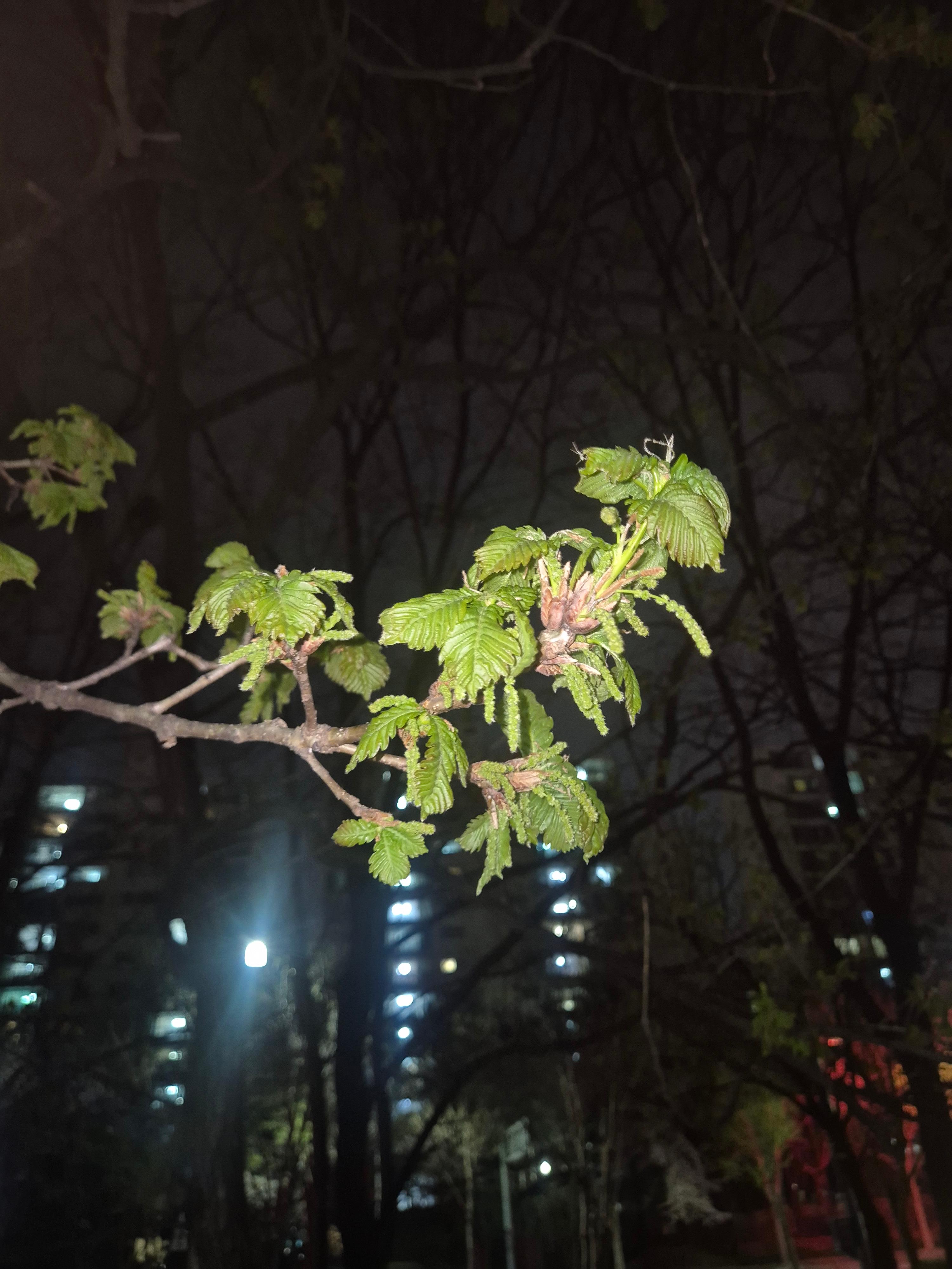 가로등 불빛에 반사된 그 연초록 잎사귀들은 마치 어둠 속에서 스스로 빛을 내는 것처럼 보였다. 주름지고 섬세하게 접혀 있는 어린잎들, 아직 완전히 펼쳐지지 않아 손바닥을 오므린 듯한 모습. 그것은 생명이 겨울의 장막을 걷어내는 바로 그 순간이었다.