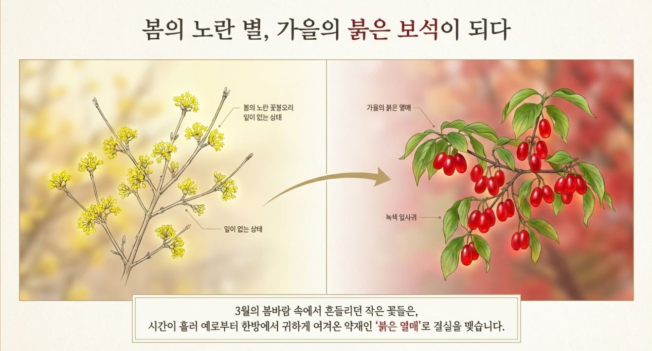 산수유의 가치는 봄의 미학에서 멈추지 않습니다. 봄철 나무를 감싸던 노란 빛의 에너지는 시간이 흐를수록 나무의 깊숙한 곳으로 스며들어, 가을이 되면 선명한 붉은 열매로 결실을 맺습니다. 이 열매는 예로부터 한방에서 매우 귀하게 여겨온 약재로, 우리 선조들의 건강을 지키는 든든한 버팀목이었습니다.