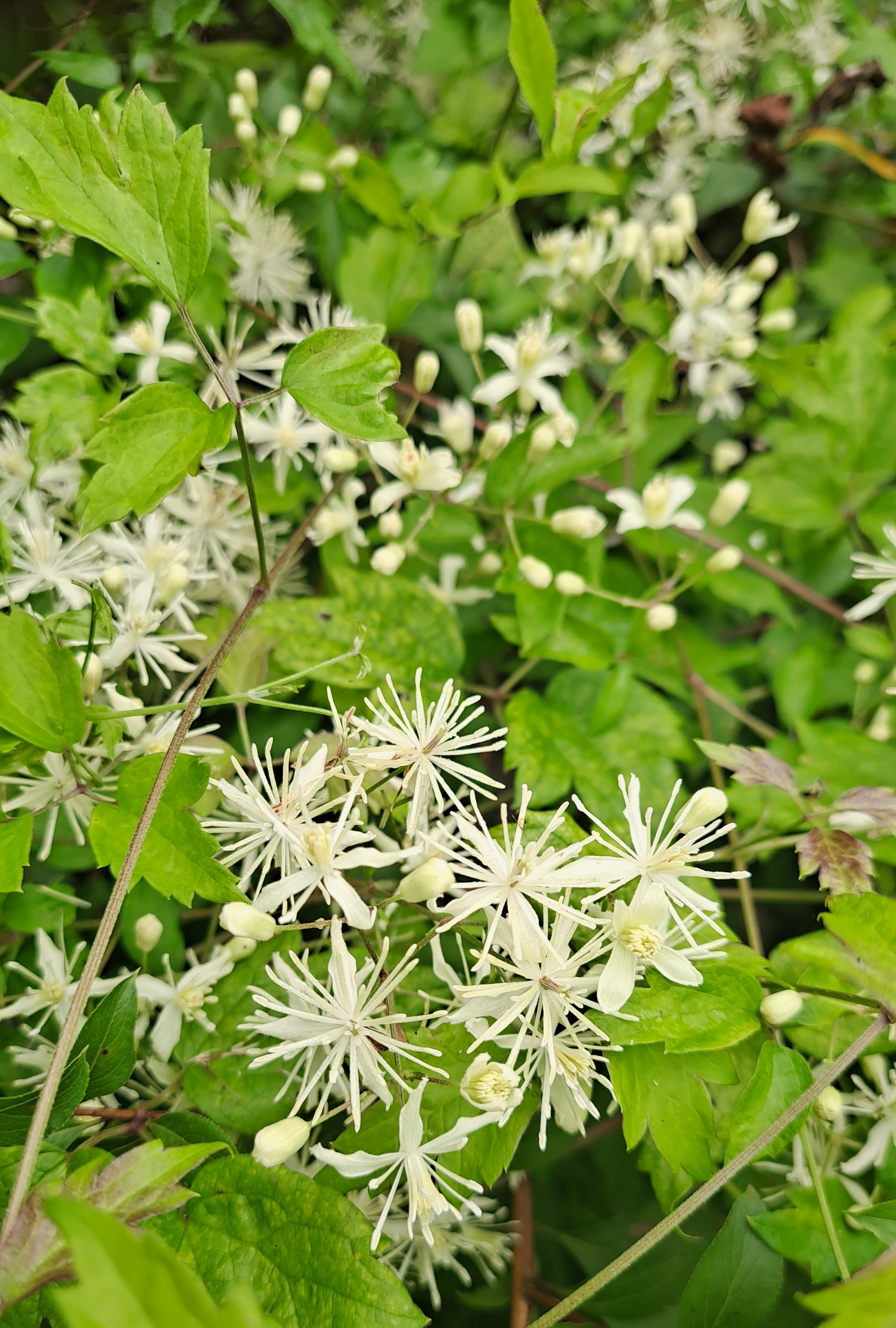 길이가 3m에 달하며 줄기에 세로 능선이 있고 어린 가지에 잔털이 있다. 잎은 대생하고 3출복엽 간혹 2회3출한다. 소엽은 난형 또는 난상 피침형이며 점첨두이고 길이 4-7cm로서 원저 또는 넓은 예저이며 결각상의 톱니가 드문드문 있고 표면에 처음에는 털이 있으나 점차 없어지며 뒷면 맥위에 잔털이 있다. 꽃은 7-9월에 피고 액생하는 짧은 취산화서 또는 원추화서에 달리며 화경은 길이 5-12cm이고 꽃은 지름 13-25mm이다. 꽃받침잎은 4개로서 피침상 도란형이며 길이 7-10mm로서 백색이고 표면에 잔털이 있으며 수술은 꽃받침과 길이가 거의 같다. 꽃잎은 4장으로 십자형이고, 암술과 수술은 각각 여러개이다 수과는 5-10개가 모여 달리고 좁은 난형이며 담갈색털이 있는 화주가 달려있다. 암술대가 달려 있다. 암술대에는 길이 1cm 정도의 백색 또는 연한 갈색 털이 있으며 열매는 9월에 성숙한다.