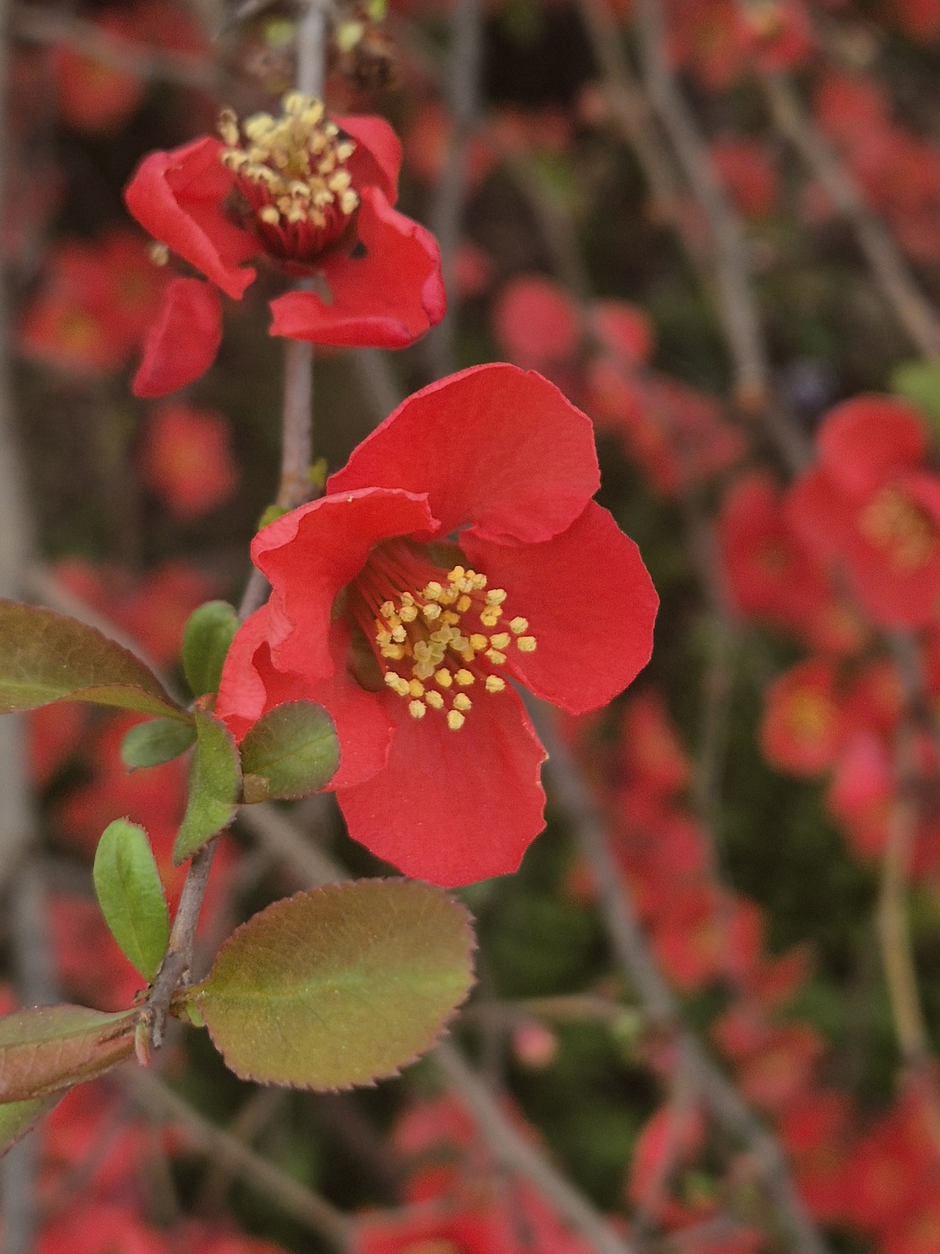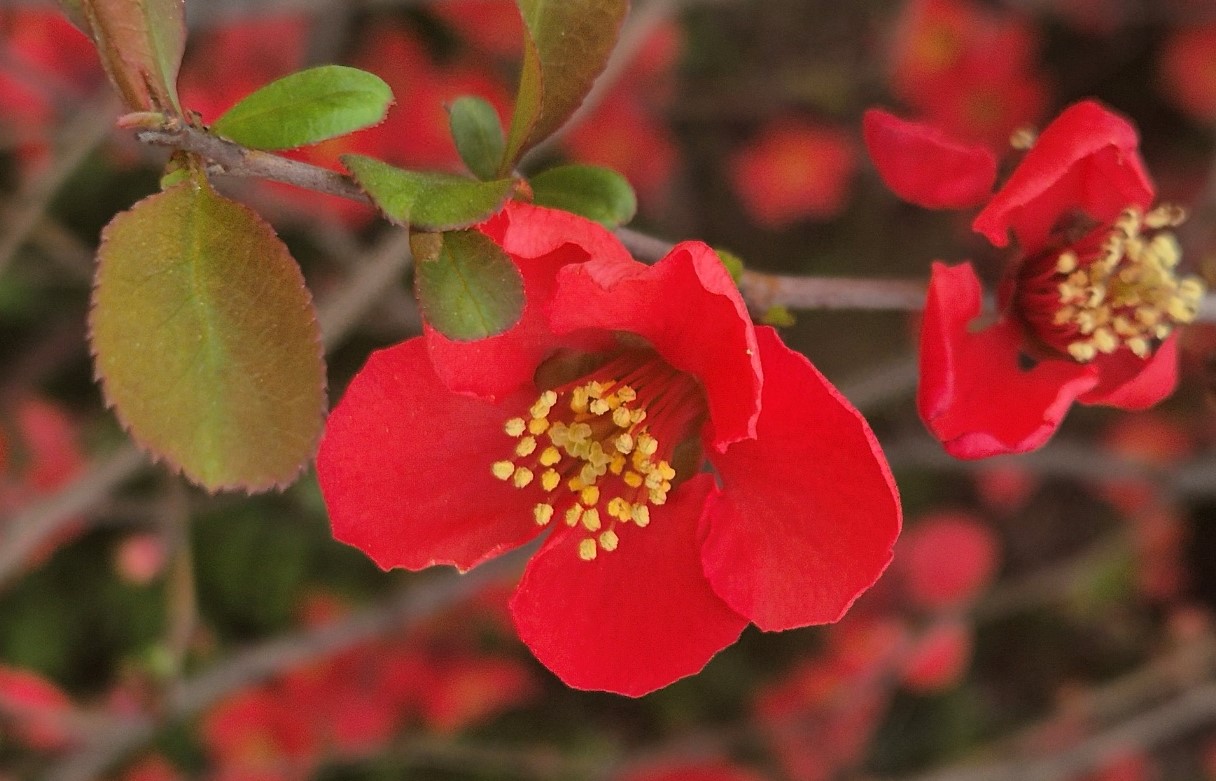 4~5월에 붉은색 꽃이 짧은 가지에 달려 핀다. 분홍색·흰색 꽃 등, 여러 품종이 개발되어 있다.