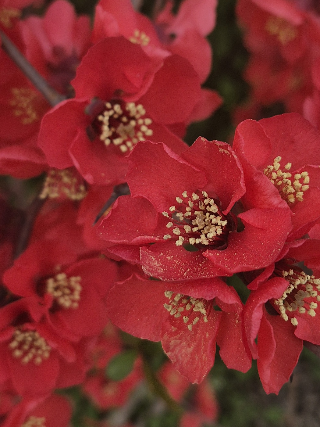4~5월에 붉은색 꽃이 짧은 가지에 달려 핀다. 분홍색·흰색 꽃 등, 여러 품종이 개발되어 있다.