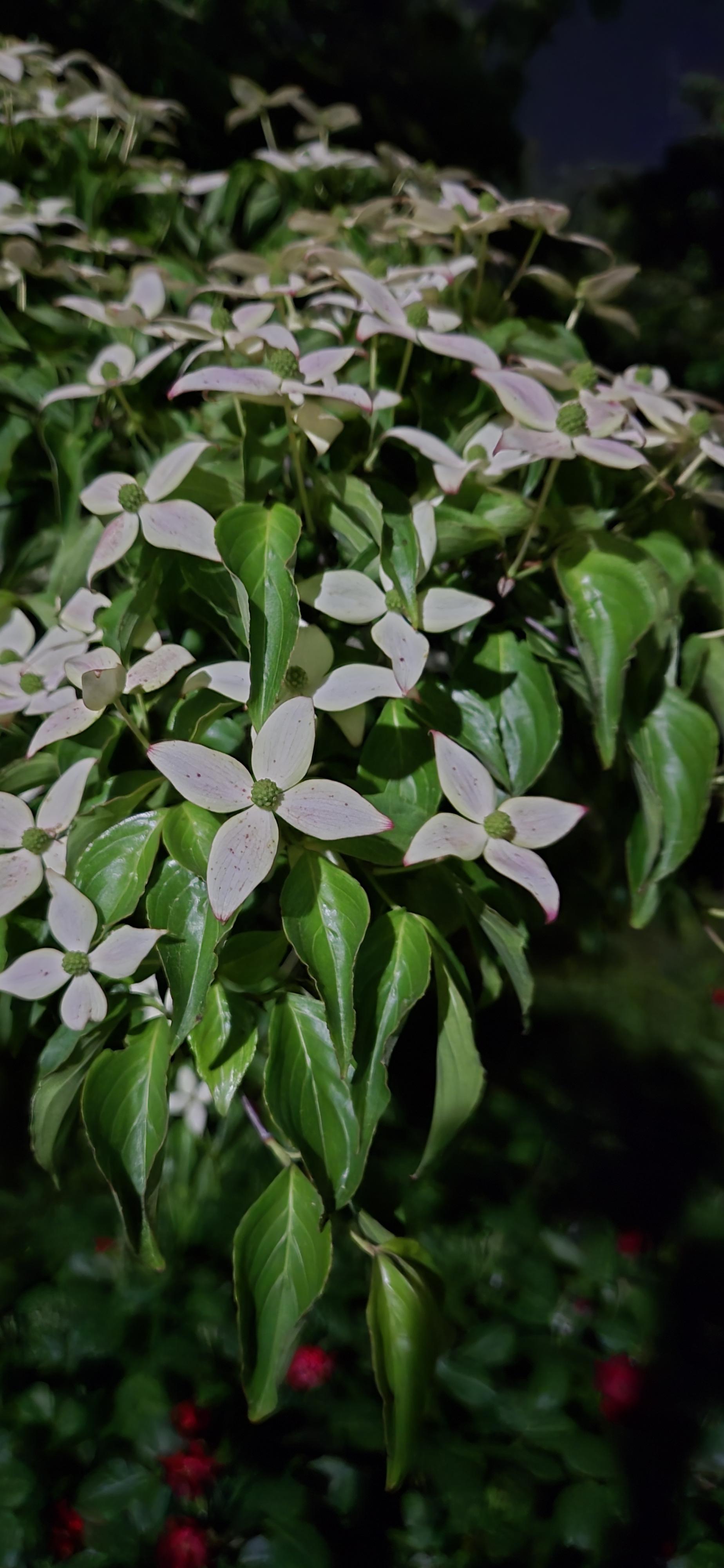 Like a dogwood tree, it grows in layers, spreading out its branches widely, and its white flowers bloom upward.