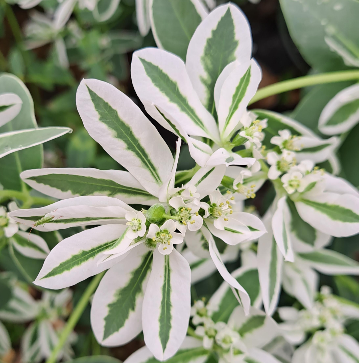 설악초의 잎은 줄기 아랫쪽은 녹색, 줄기 윗쪽의 잎은 흰색 테두리가 있어 위에서 봤을때 하얗게 꽃처럼 보입니다