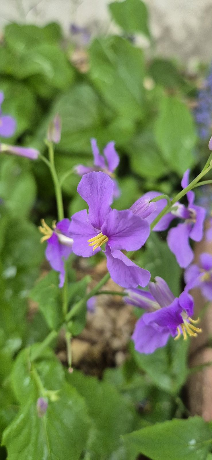 꽃은 봄에 푸른빛을 띤 자주색으로 줄기 끝에 모여 피는데, 꽃 지름은 3cm이고 꽃잎은 네 장이다.