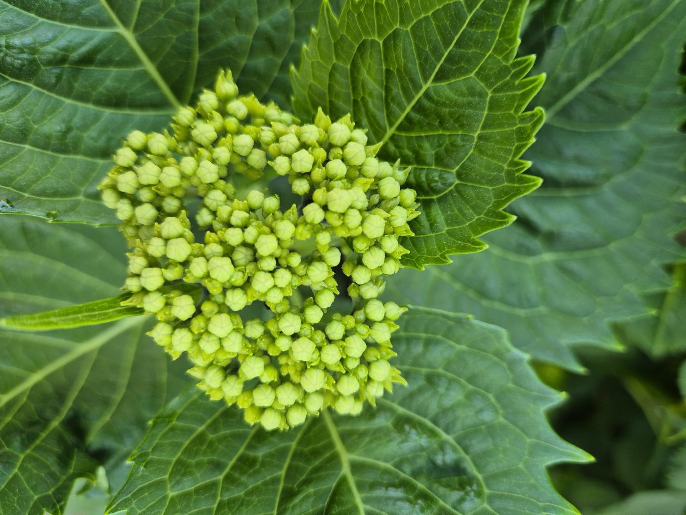 수국 [ Bigleaf hydrangea , 水菊 ] 수국의 꽃은 산방꽃차례로 달리고 둥근 공 모양이다.