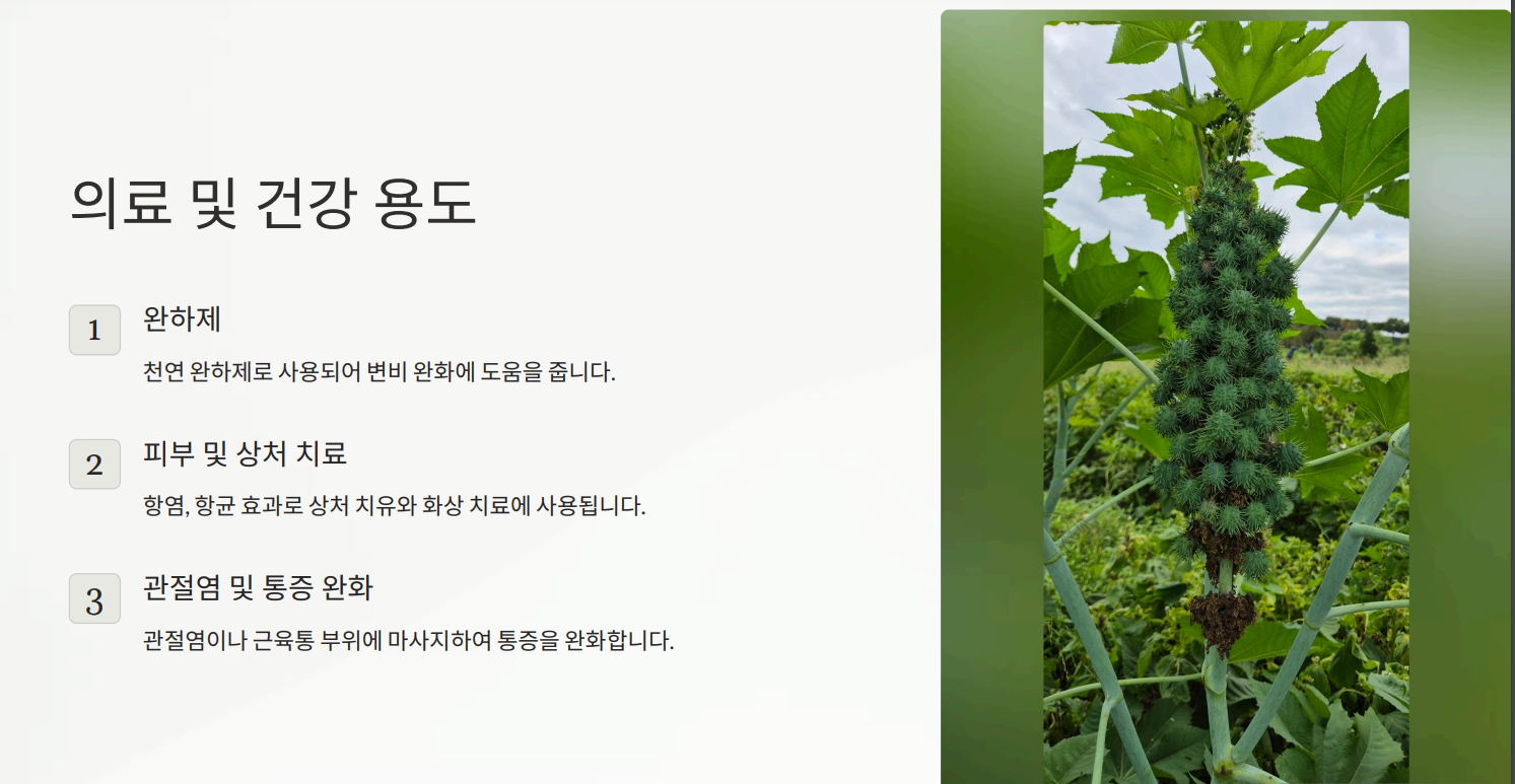 | 아주까리 기름(피마자유, Castor Oil), 아주까리(Ricinus communis)에서 추출한 기름 (9) | 2024.09.25 |