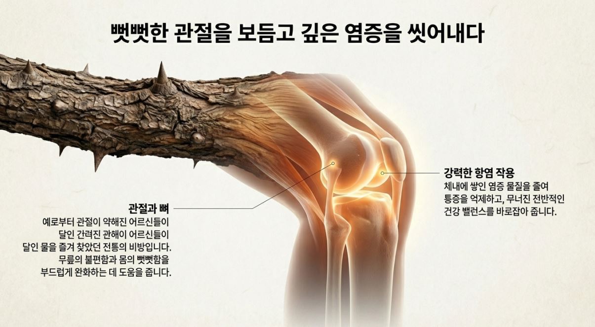 엄나무는 예로부터 어르신들의 굽은 허리와 무릎을 세워주는 든든한 조력자로 통했습니다. 단순히 일시적인 통증 완화를 넘어, 신체의 기초를 다지는 '천연 관절 영양제'로서 탁월한 가치를 지니기 때문입니다. 세월의 흐름에 따라 약해진 관절에 엄나무의 기운은 생동감을 불어넣습니다.