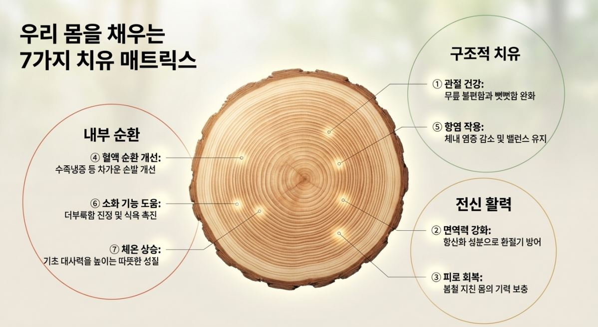 신체 내부의 흐름이 정체되면 피로가 쌓이고 손발이 차가워지는 증상이 나타납니다. 이때 엄나무는 혈관의 통로를 열어주는 '순환의 조력자'로 활약합니다. 엄나무의 성분은 혈액 순환을 원활하게 견인하여 신진대사를 촉진하며, 이는 곧 전신으로 온기가 고루 전달되어 피로 곰팡이를 씻어내는 결과로 이어집니다.