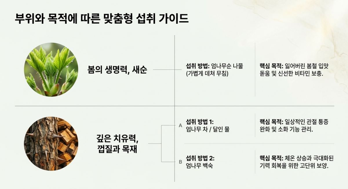 만물이 생동하는 에너지를 내뿜을 때, 오히려 몸이 무겁게 가라앉는다면 기력이 소진되었다는 신호입니다. 엄나무는 지친 몸에 활력을 불어넣는 훌륭한 기력 회복제입니다. 엄나무를 넣고 우려낸 백숙이나 따뜻한 차는 단순한 음식을 넘어, 기운을 보강하고 신체 에너지를 재충전하는 보양의 정수를 담고 있습니다.