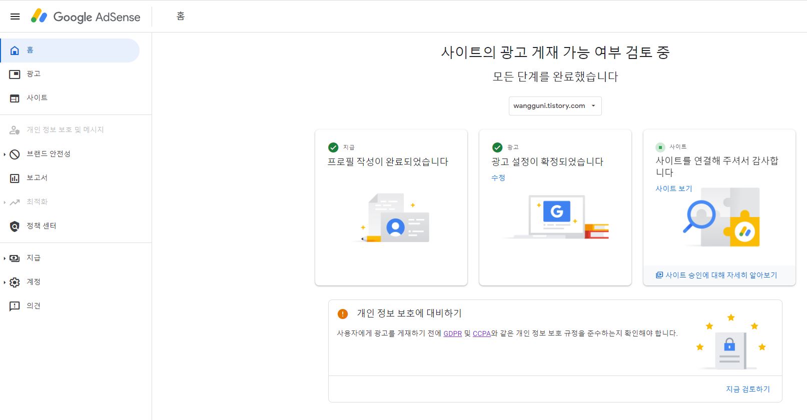 글도 몇 건 올렸고 구글 에드센스 가입도 완료, 승인도 완료 된 듯 한데, 광고는 아직 안뜨고 있거든요.