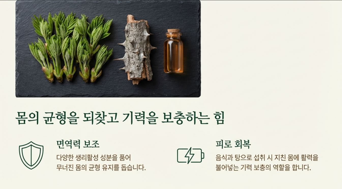 엄나무는 예로부터 몸의 기운을 보강하는 약재로 기록되어 있으며, 건강과 기력 보충에 다음과 같은 구체적인 도움을 줍니다.