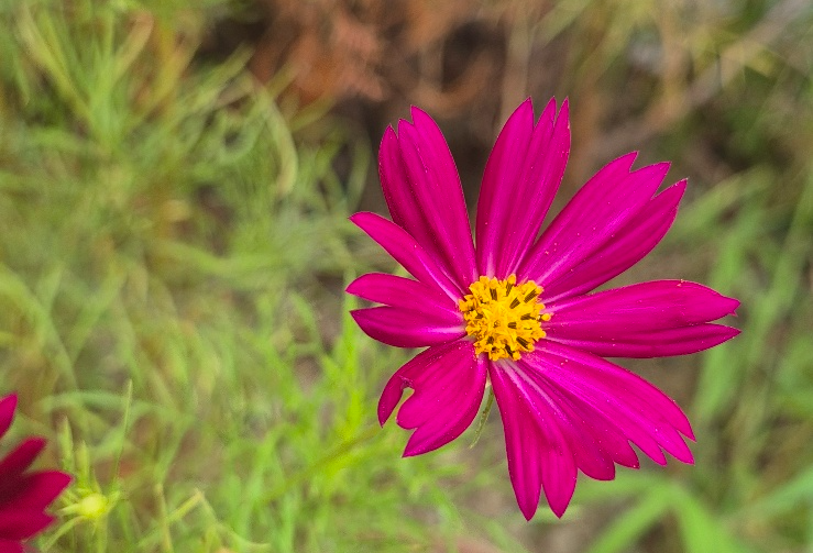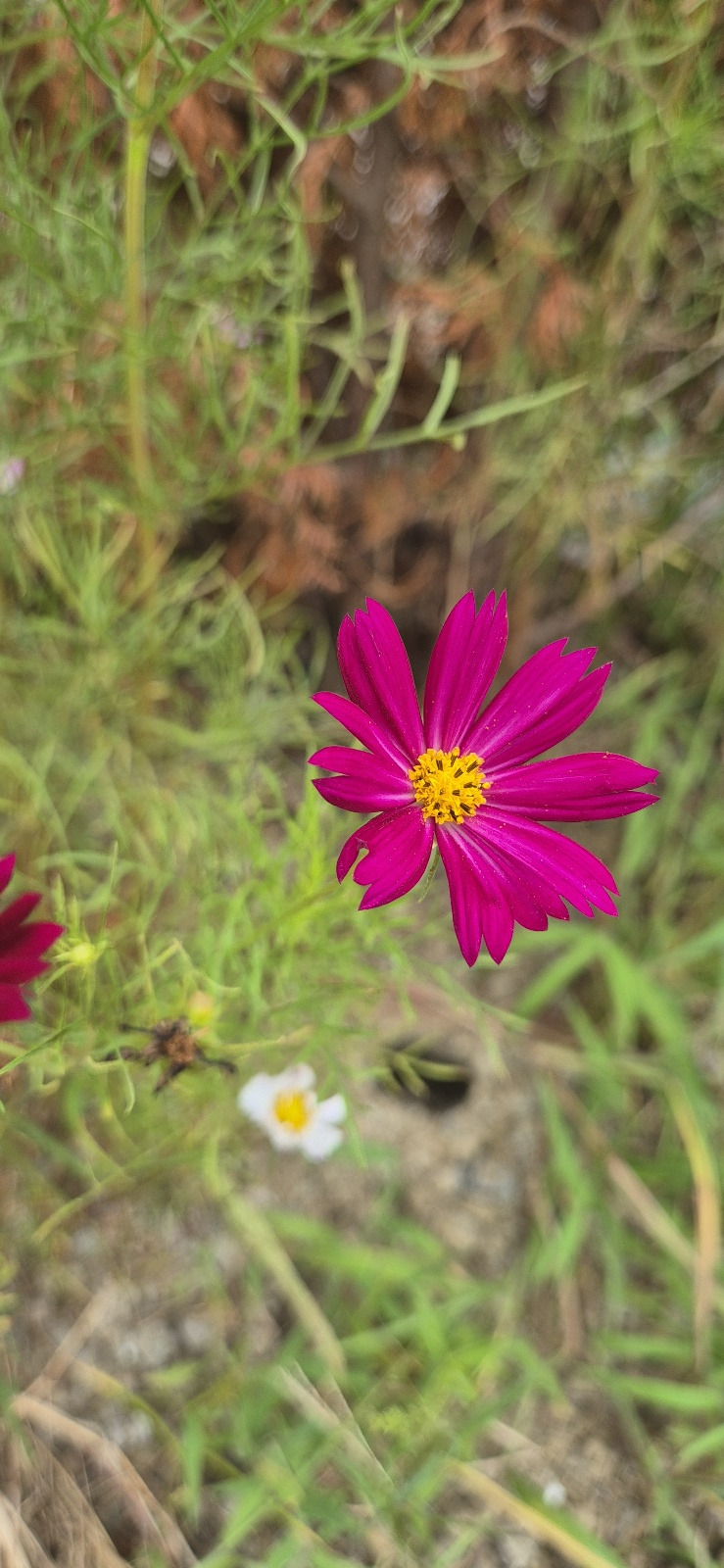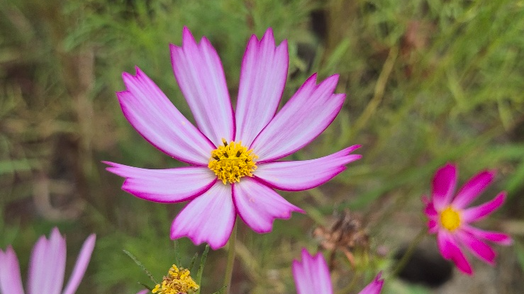 "길 옆에서 피어난 화사한 코스모스를 바라보며 잠시 여유를 즐겼습니다."