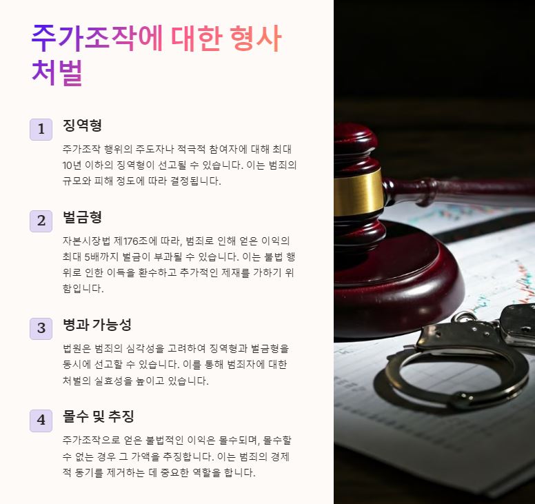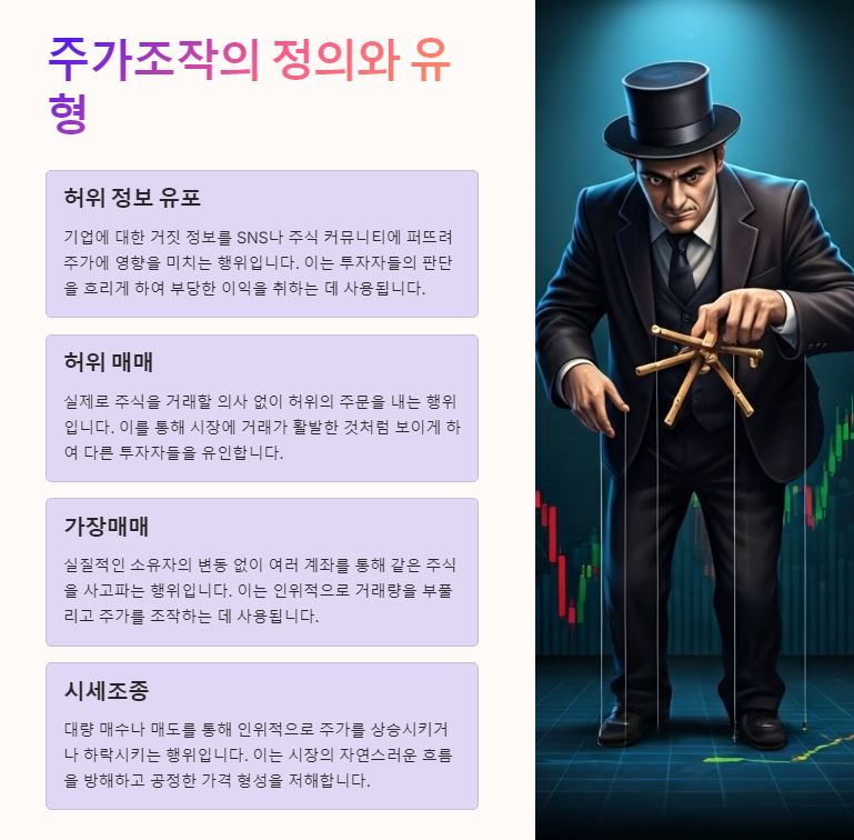 주가조작은 금융 시장의 공정성을 해치는 불법 행위로, 인위적으로 주가를 변동시켜 부당한 이익을 취하는 행위를 말합니다. 주요 유형으로는 허위 정보 유포, 허위 매매, 가장매매 등이 있습니다. 이러한 행위는 시장의 신뢰성을 훼손하고 투자자들에게 막대한 손실을 초래할 수 있습니다.