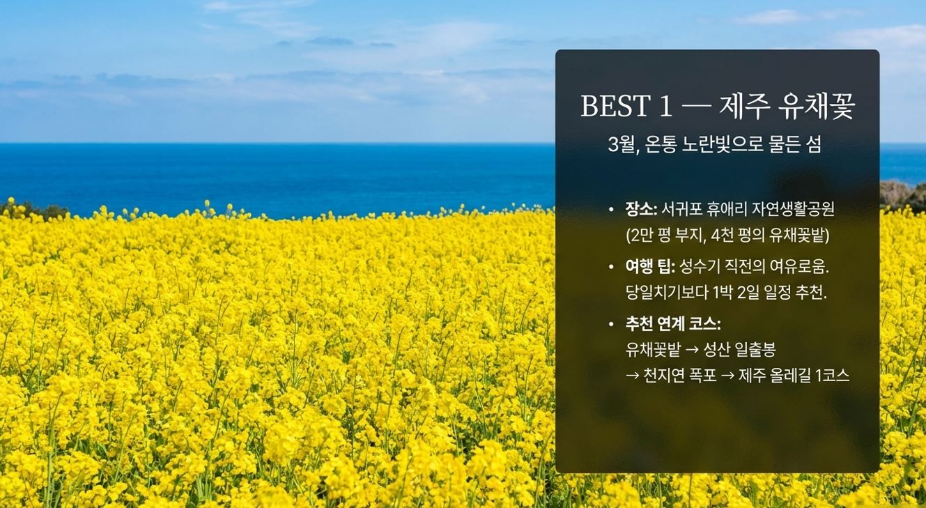제주는 당일치기보다는 1박 2일을 추천드립니다. 3월 제주는 성수기 직전이라 숙박 요금도 비교적 저렴하고 관광객도 많지 않아 여유롭게 즐길 수 있는 최적의 시기입니다.