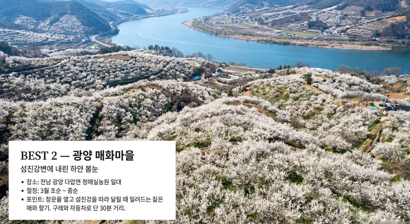 섬진강을 따라 드라이브하며 창문을 열면 매화 향기가 차 안으로 밀려들어오는 그 느낌, 한번 경험하면 매년 3월 광양을 찾게 됩니다.