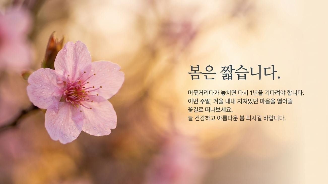 이번 주말, 가까운 봄꽃 명소로 떠나보세요. 꽃 한 송이가 주는 위로와 생명력이 겨울 내내 지쳐있던 마음을 활짝 열어줄 겁니다 🌸
