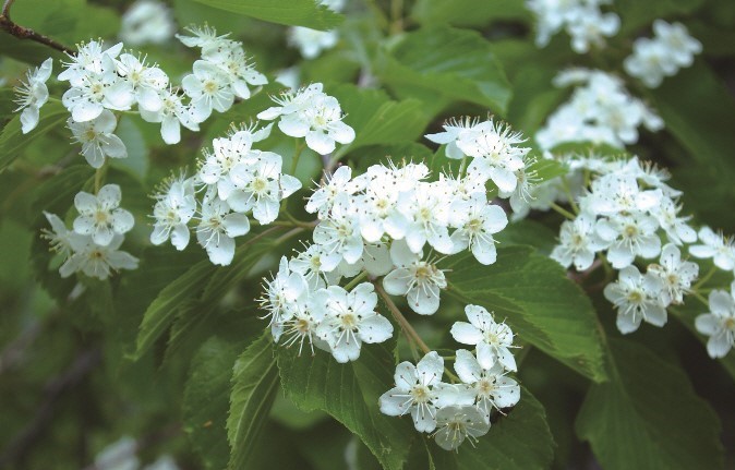 꽃은 5월에 피고 흰색이며 6∼10개의 꽃이 산방꽃차례에 달린다.