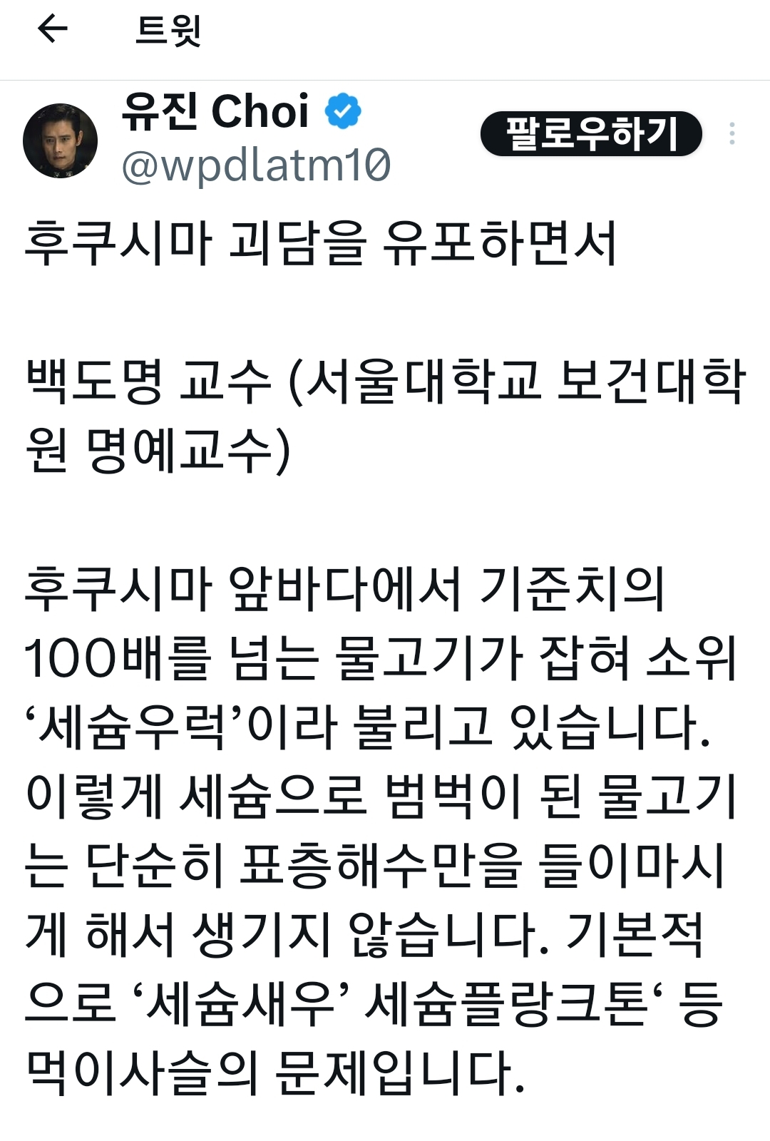 “후쿠시마 괴담을 유포하면서 백도명 교수 (서울대학교 보건대학원 명예교수) 후쿠시마 앞바다에서 기준치의 100배를 넘는 물고기가 잡혀 소위 ‘세슘우럭’이라 불리고 있습니다. 이렇게 세
