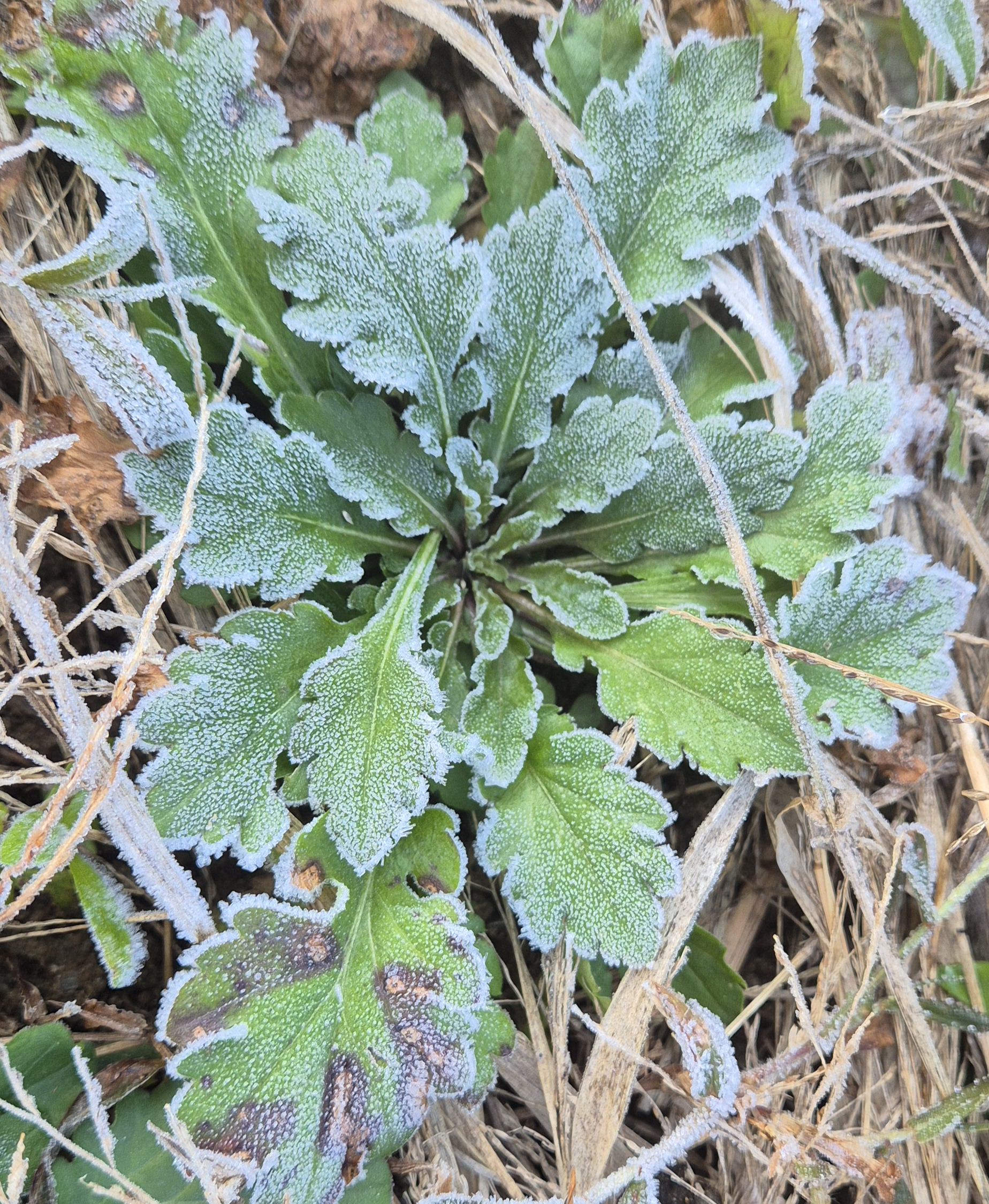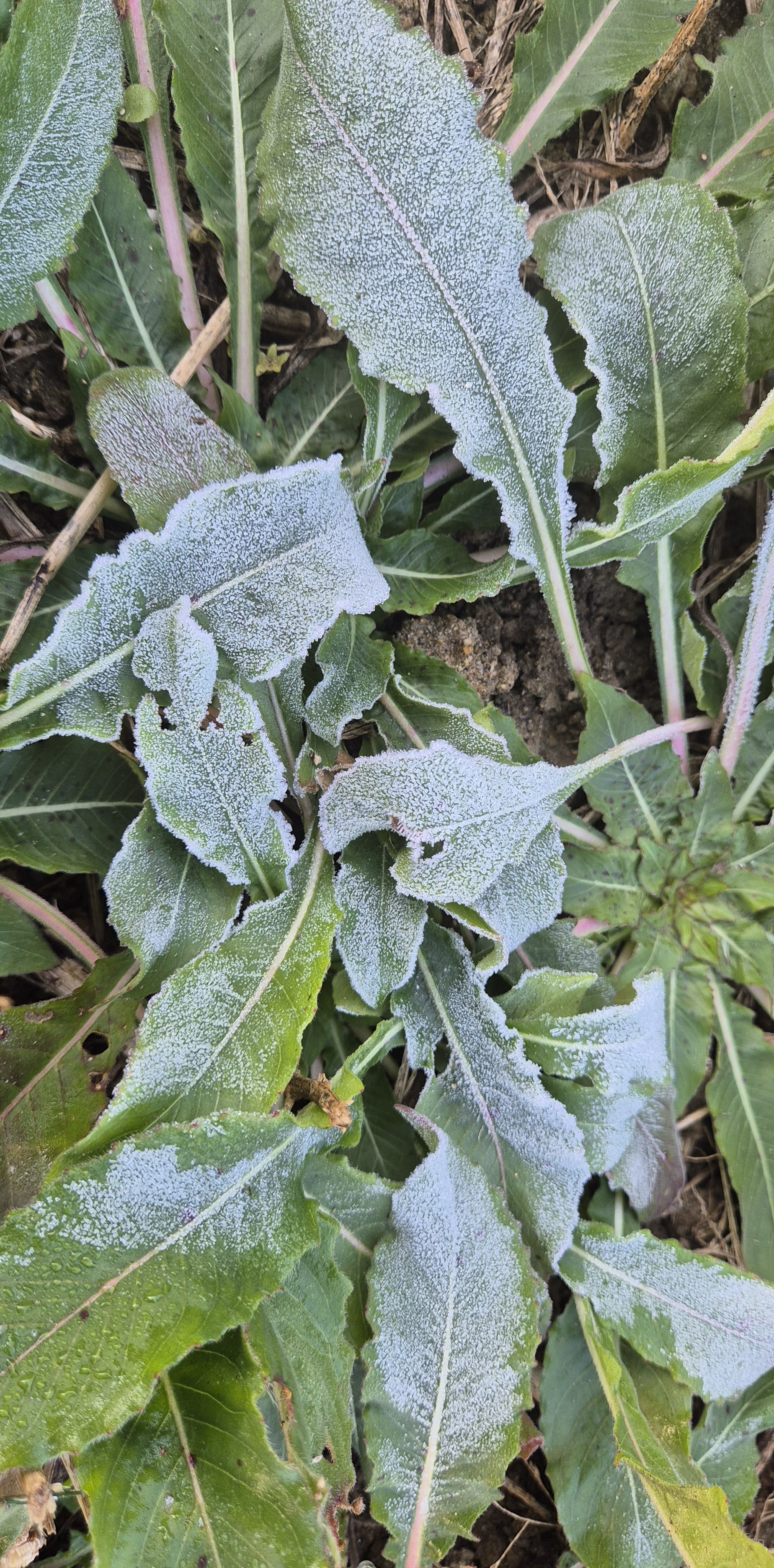 농장 그늘진 곳 풀 잎 위에 하얀 무서리가 내린날