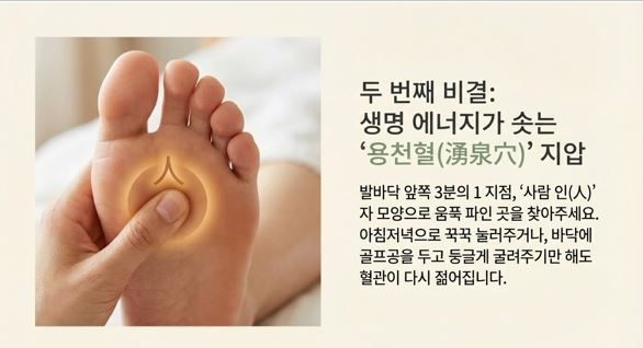 - 활용 팁: 손으로 누르기 힘들다면 골프공이나 둥근 막대를 바닥에 두고 해당 부위로 굴려주세요. 당신의 혈관이 다시 젊어지는 것을 느낄 수 있습니다.