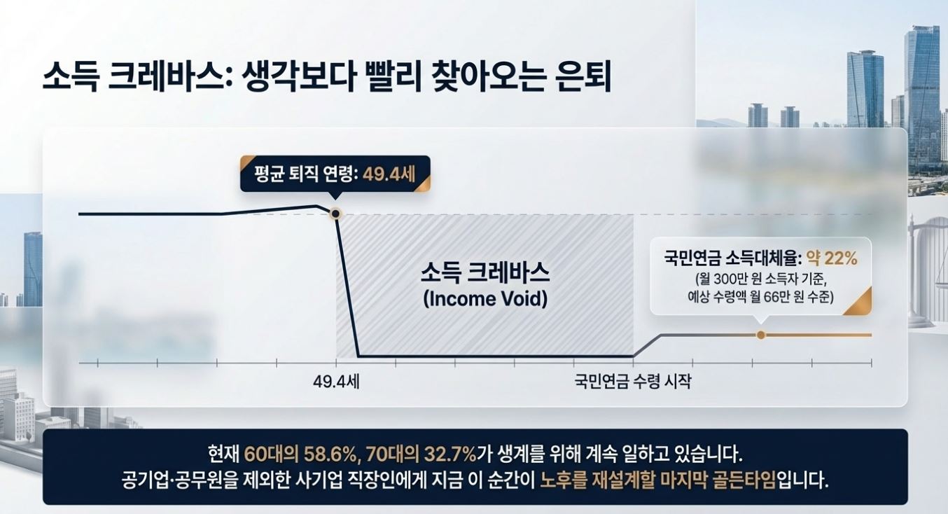 국민연금의 소득대체율은 약 22%로, 월 300만 원을 벌던 직장인이 은퇴 후 받을 수 있는 연금은 월 66만 원 수준에 불과합니다. 60대의 58.6%, 70대의 32.7%가 생계를 위해 계속 일하고 있는 것으로 나타났습니다.