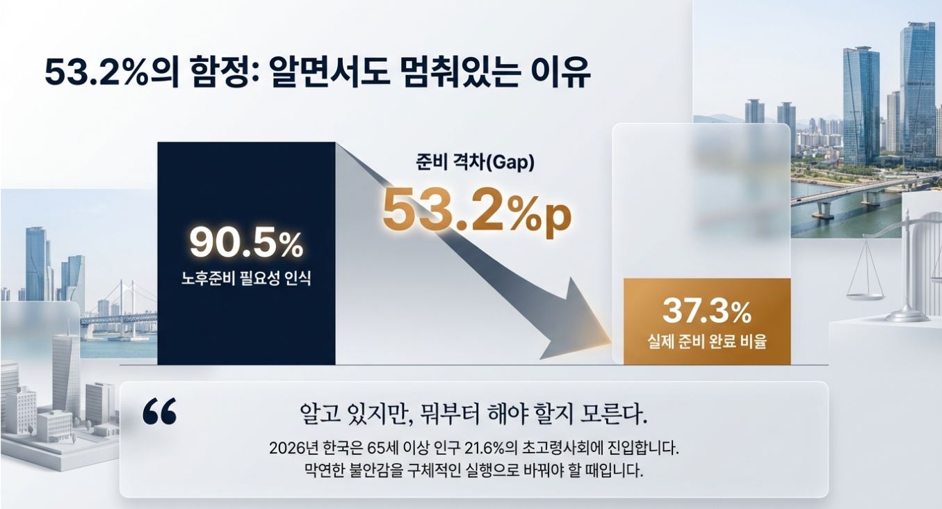 노후준비가 필요하다고 인식하는 4050세대는 90.5%에 달하지만, 실제로 준비를 완료한 비율은 37.3%에 불과합니다.