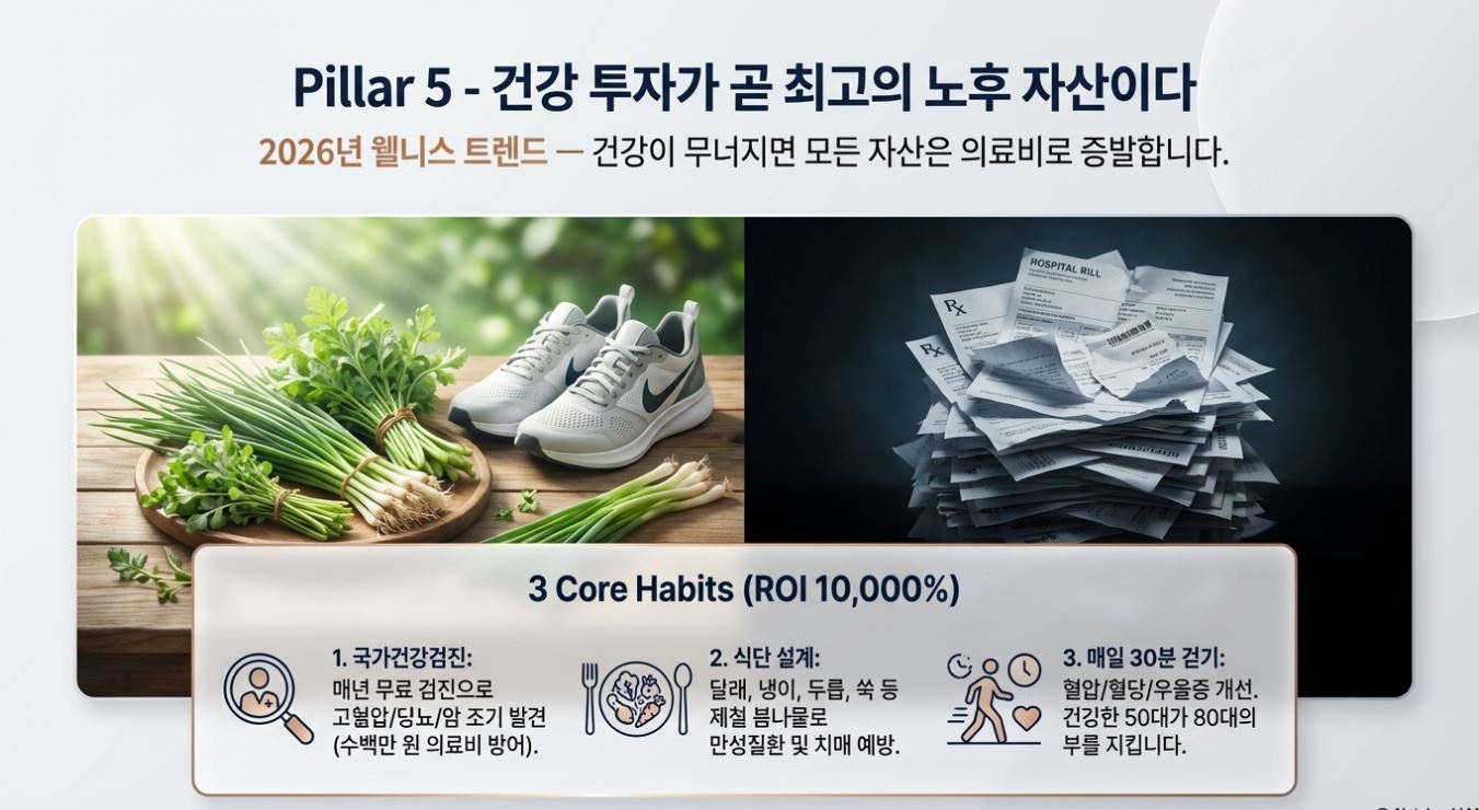 노후를 준비한다고 하면 돈 이야기만 하는 경우가 많습니다. 하지만 건강이 무너지면 아무리 많은 돈을 모아둬도 의료비로 다 사라집니다.