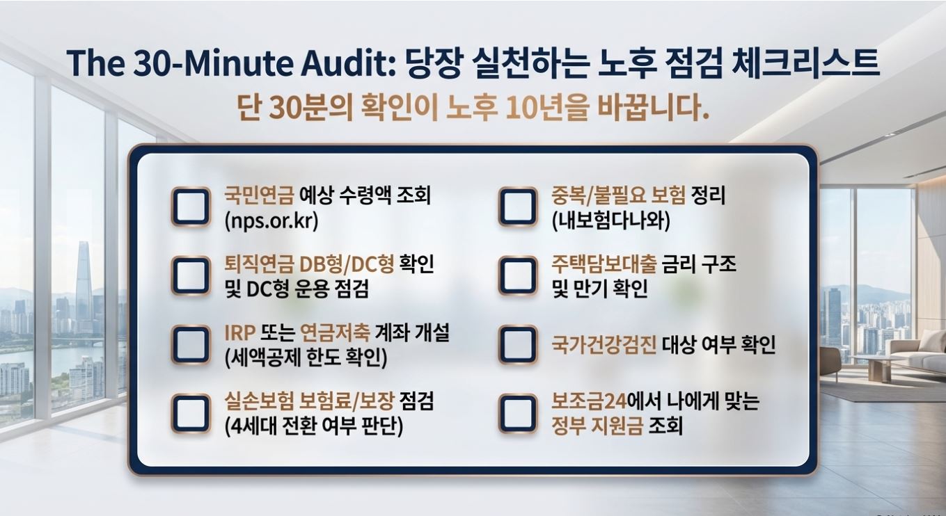 이 여덟 가지를 오늘 확인하는 데 걸리는 시간은 30분이면 충분합니다. 그 30분이 노후 10년을 바꿀 수 있습니다.